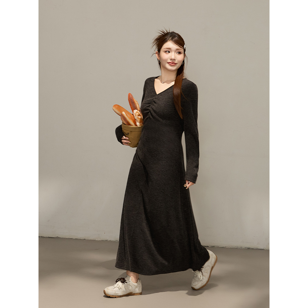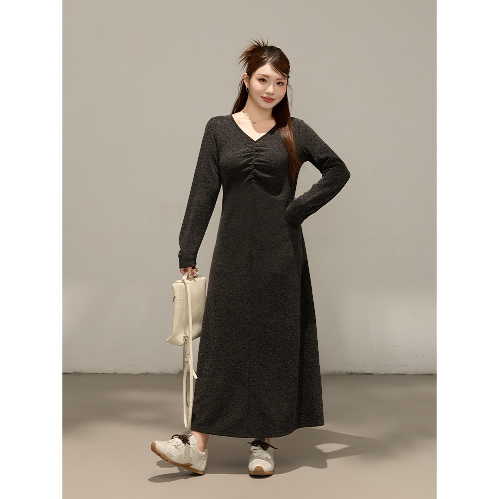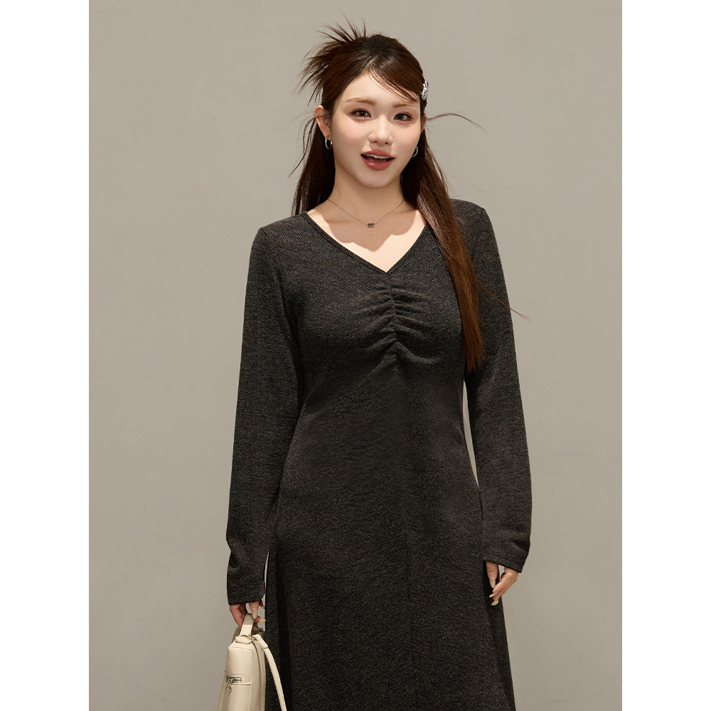 简约通勤V领碎褶针织裙秋季新款胖mm大码女装收腰显瘦连衣裙