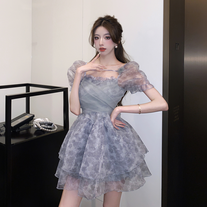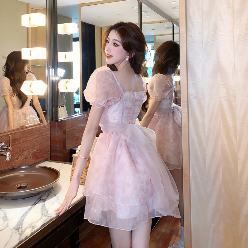 甜美公主短裙印花网纱绑带高腰A字短袖连衣裙女2025夏季新款