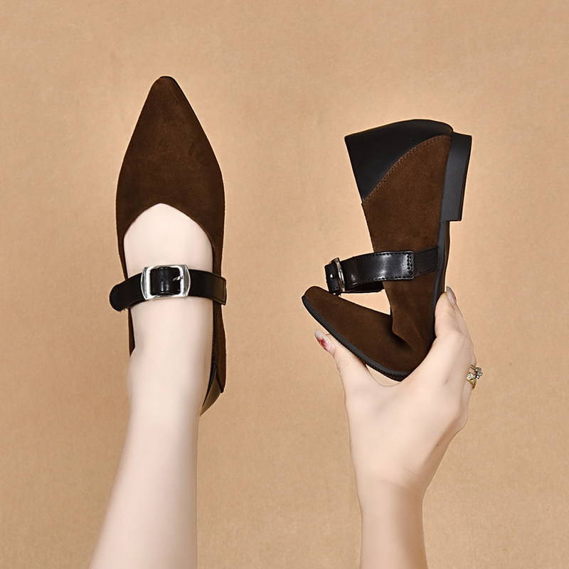 法式尖头磨砂羊皮玛丽珍鞋女软皮平底新款皮带扣复古平底小众单鞋