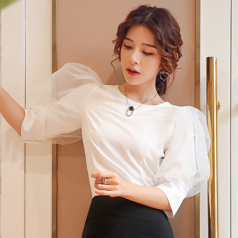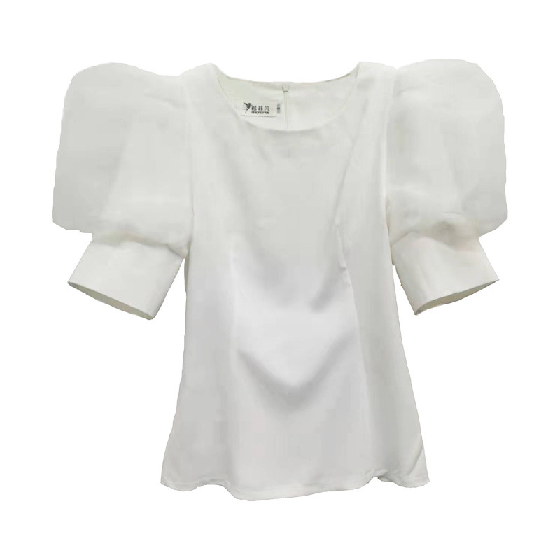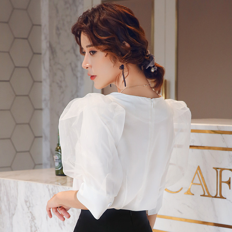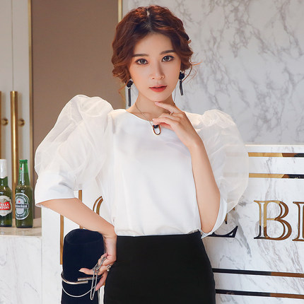 2026韩版新款欧根纱泡泡袖上衣女套头时尚薄款雪纺衫显瘦短袖衬衫