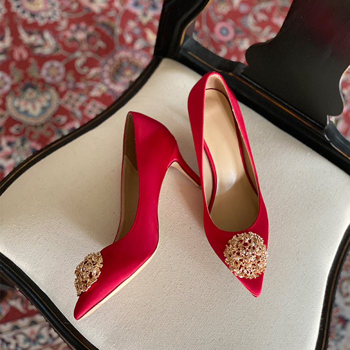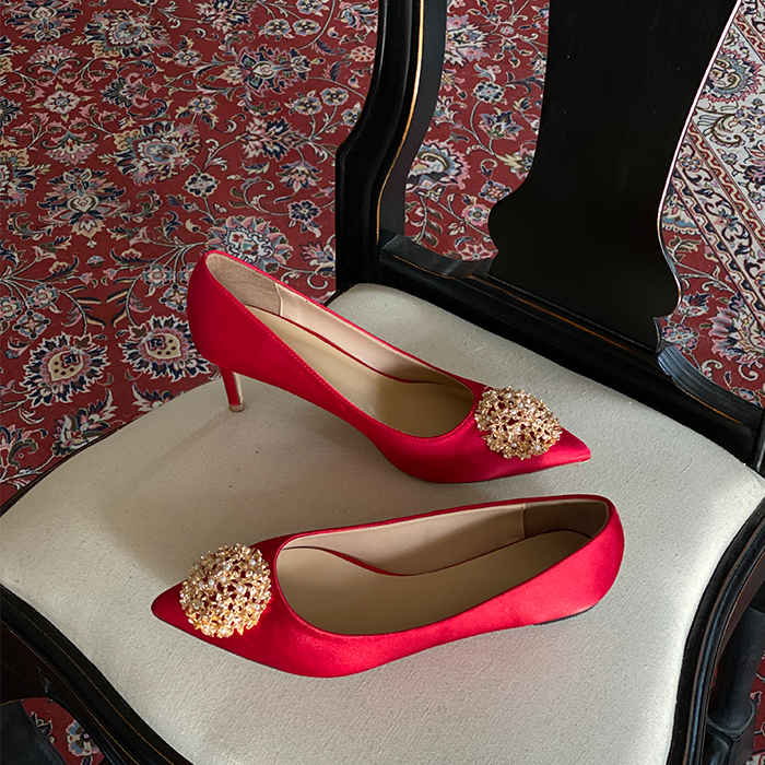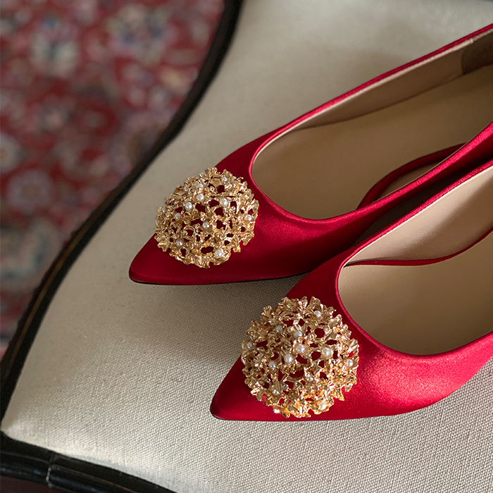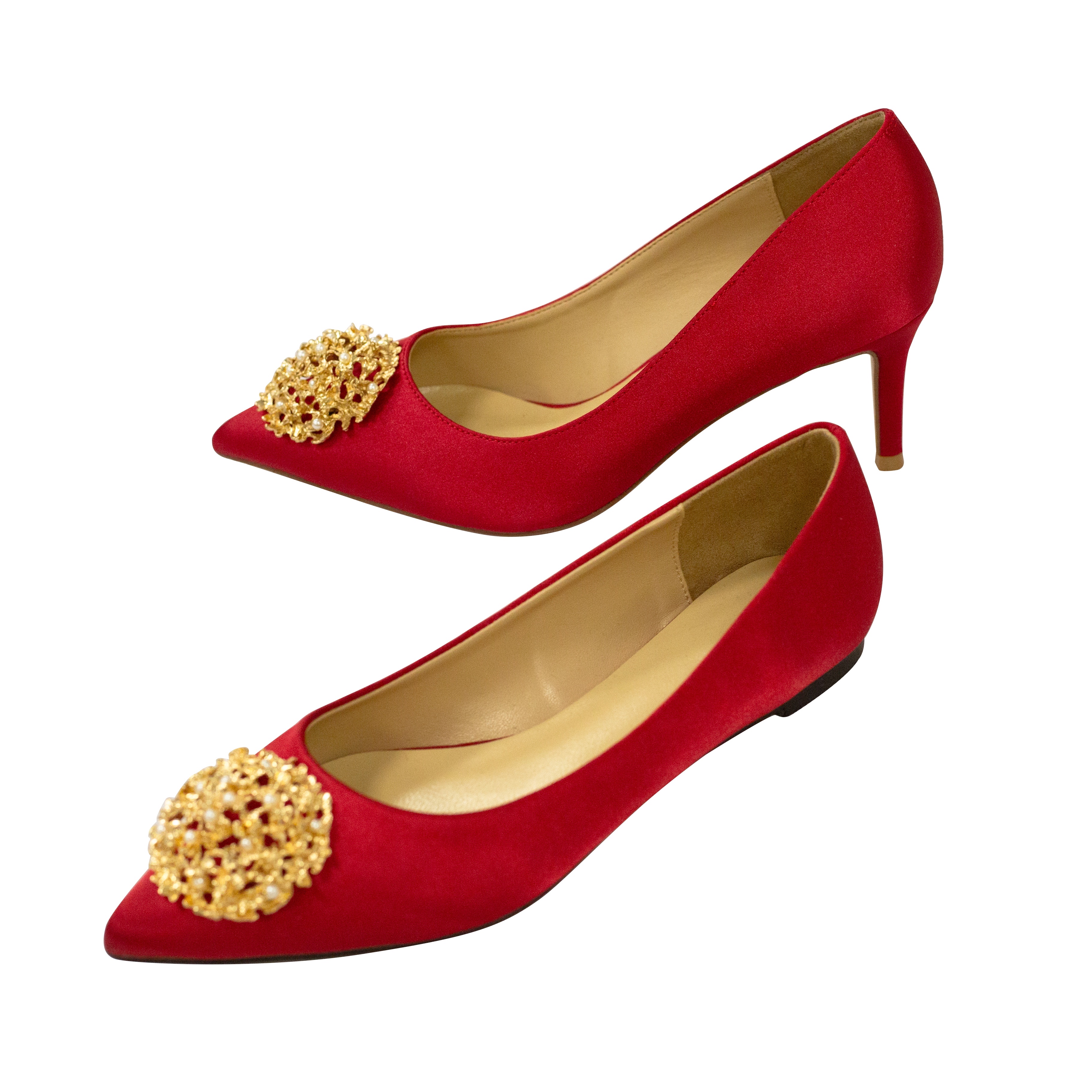 Cerfmia小鹿弥雅 手工红色缎面金珊瑚气质平底高跟婚鞋