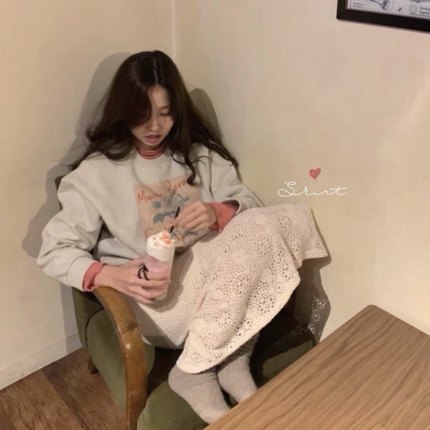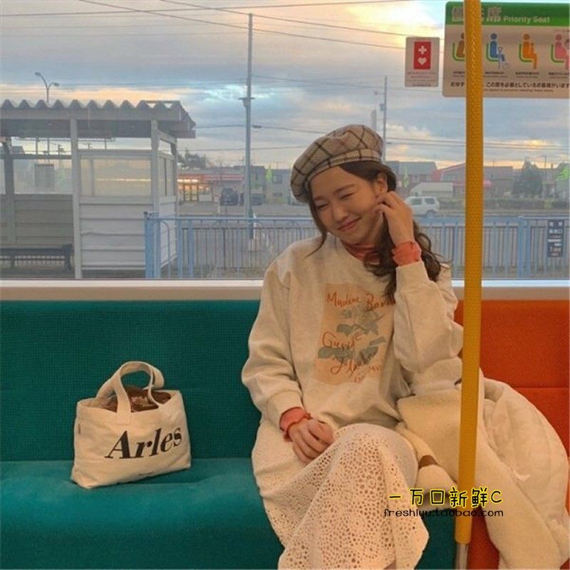 玫瑰唱片机 法式少女圆领宽松卫衣 韩国复古印花学院长袖套头绒衫