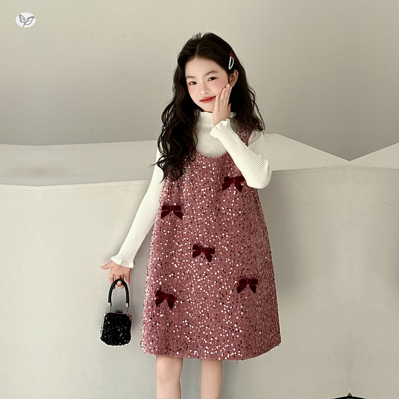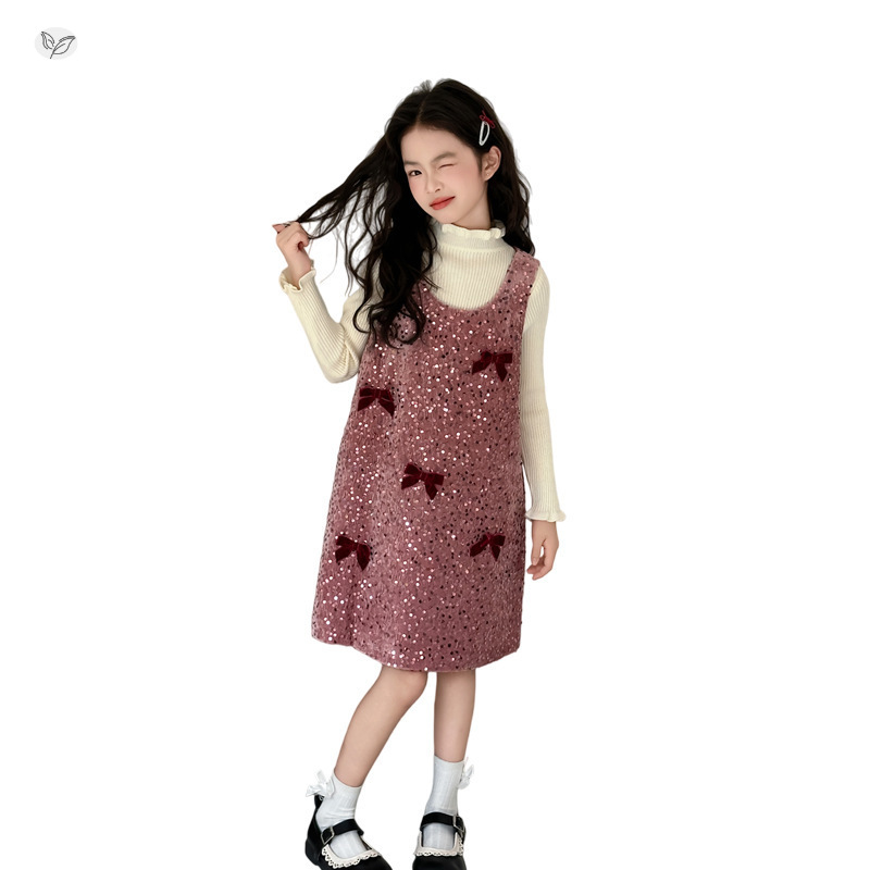 女童2025年冬季新款藕粉蝴蝶结亮片连衣裙女大童夹棉加厚保暖裙子