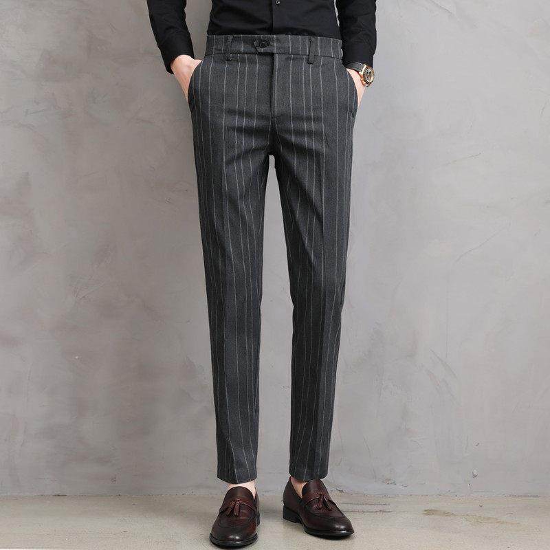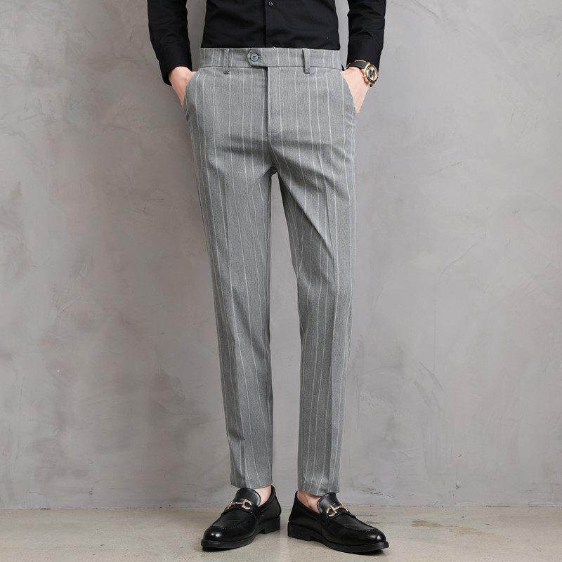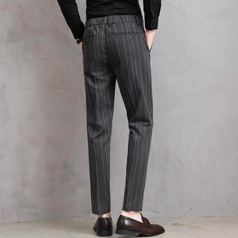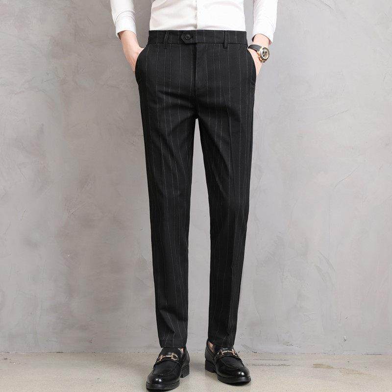 春季薄款男士休闲裤修身小脚长裤松紧腰条纹商务西装裤直筒0118r
