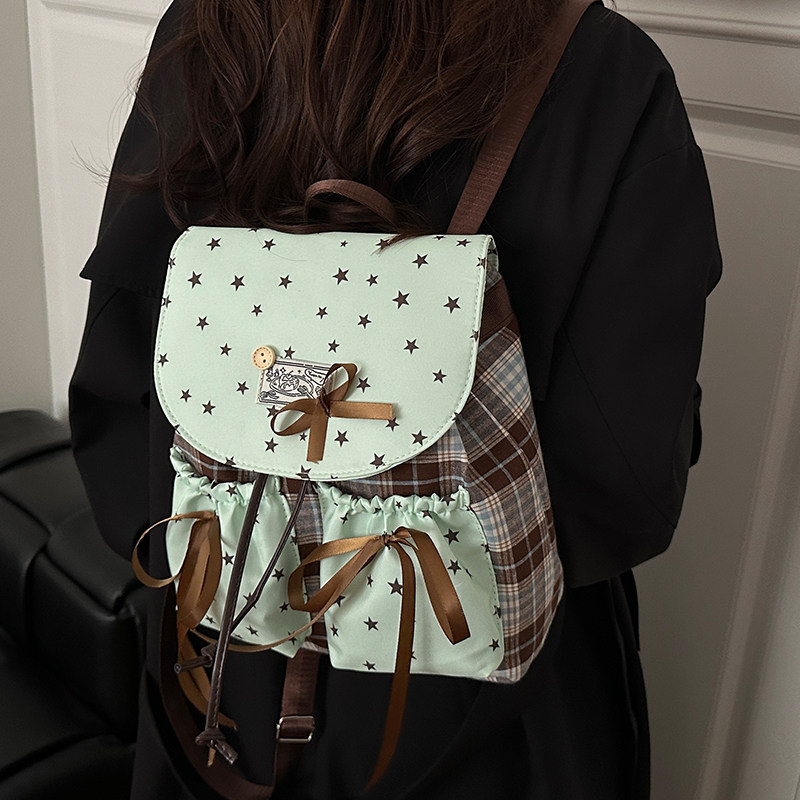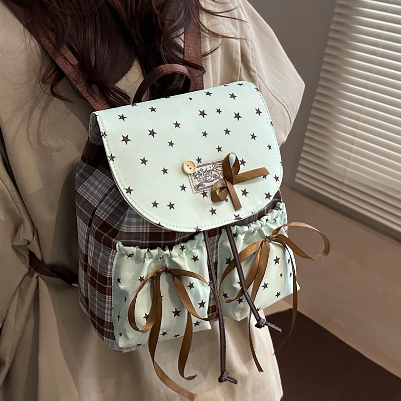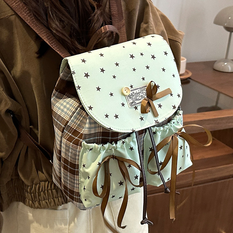 2025韩版小清新星星格纹双肩包女蝴蝶结抽绳小背包少女高颜值书包