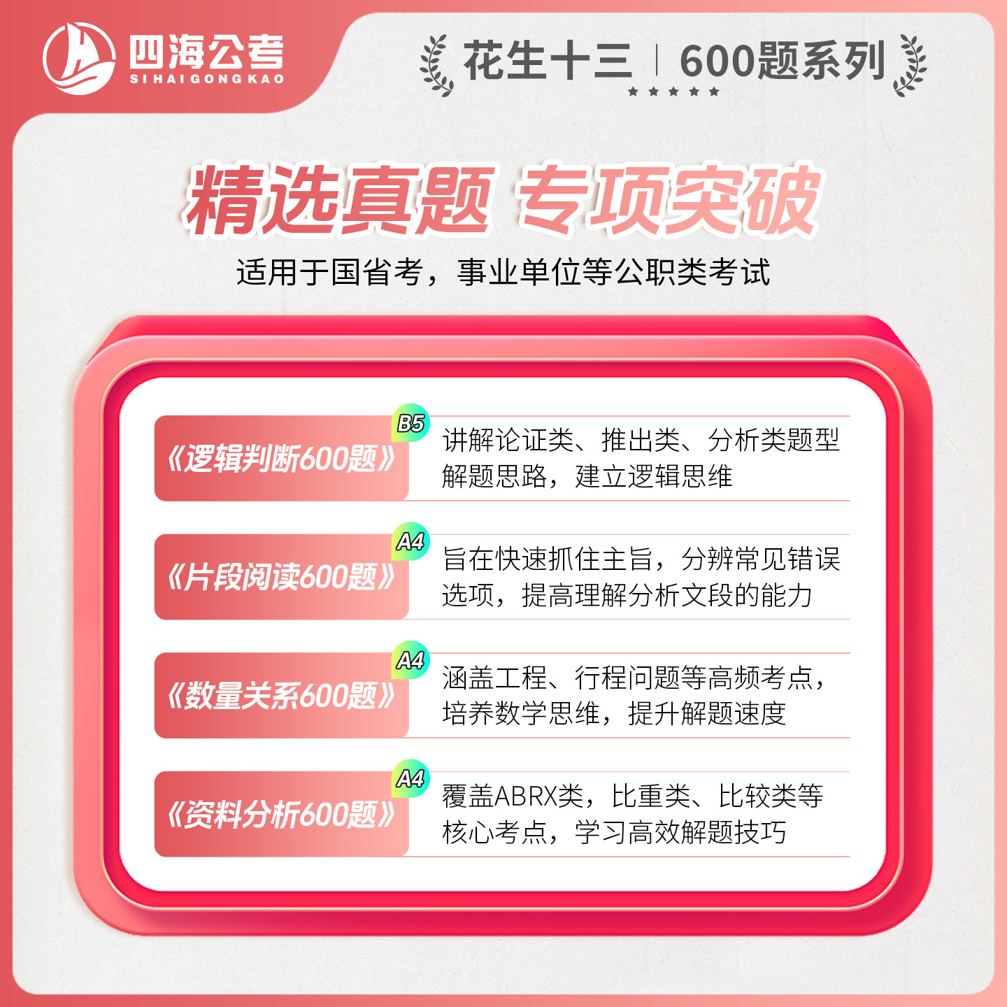 【4套600题送磁吸书签】花生十三600题系列四海公务员考试国考省考事业单位行测