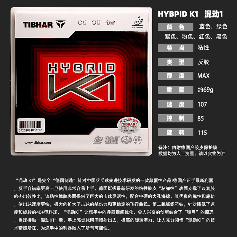 TIBHAR挺拔专业乒乓球拍胶皮混动K1进口德系粘性胶皮控制型套胶