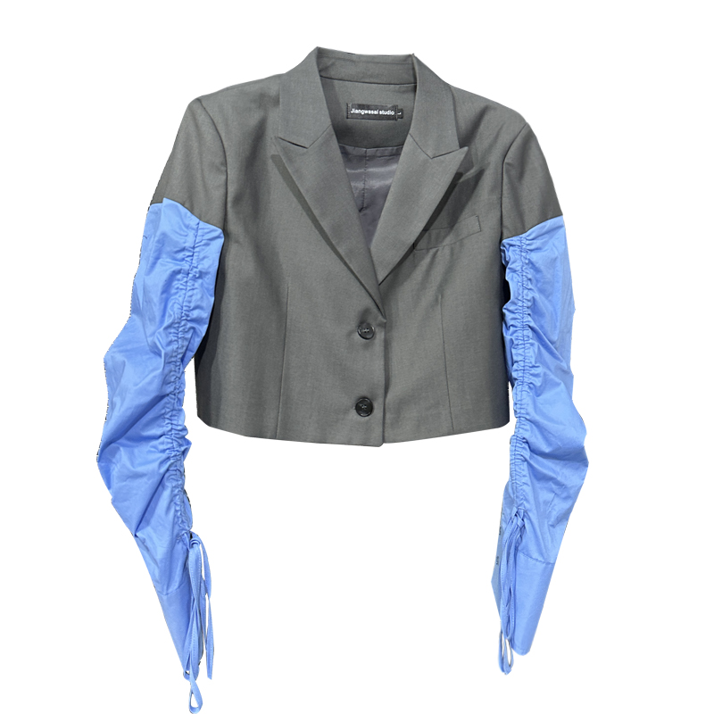 蒋哇塞 小众设计感斩女褶皱衬衫袖拼接西服短款春季撞色外套百搭