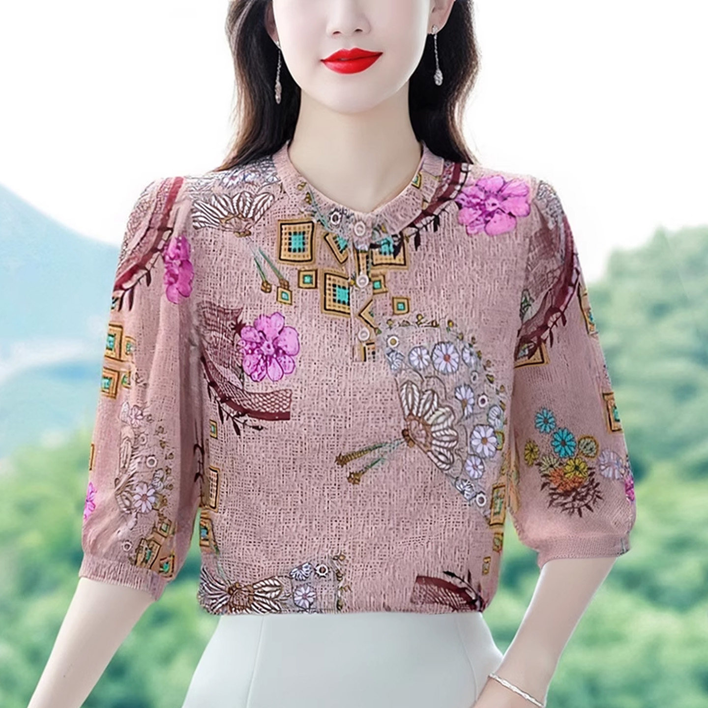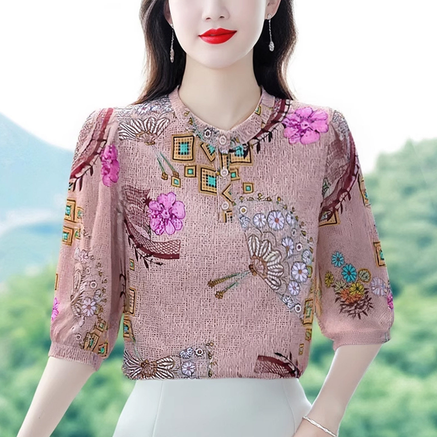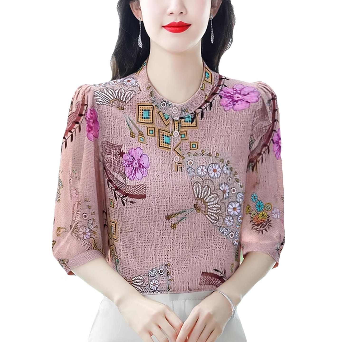 碎花雪纺衫女2025夏季新款国风印花七分袖上衣遮肚子显瘦中袖小衫
