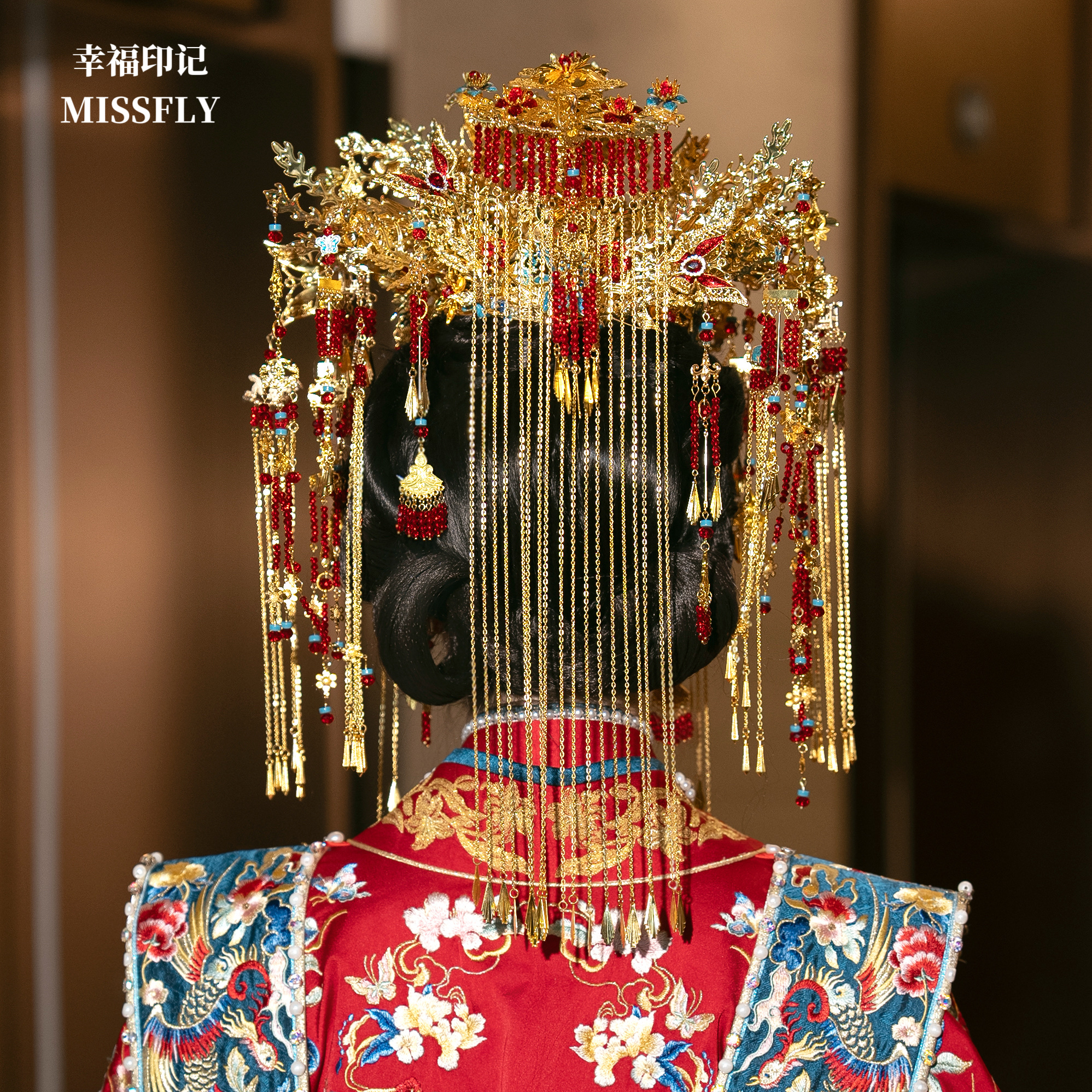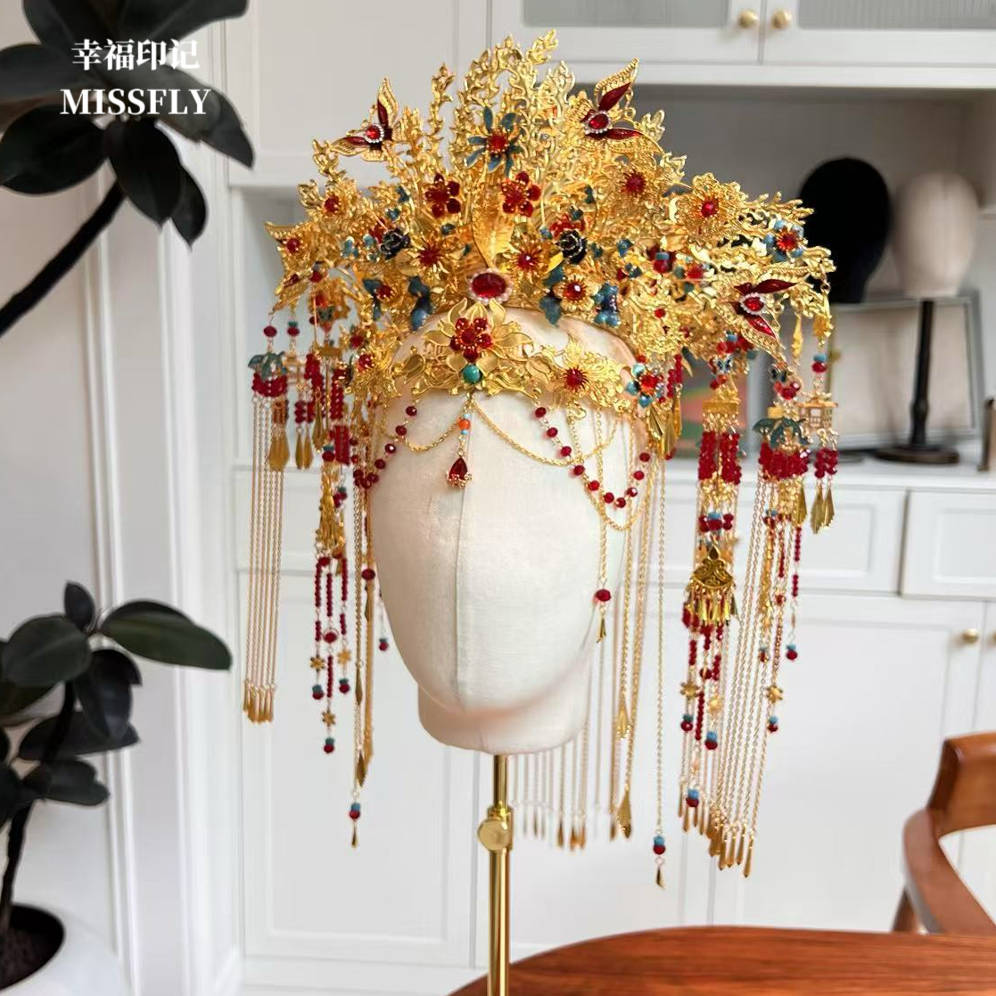 金色凤冠新娘头饰金红蓝秀禾汉服龙凤褂凤凰高端婚礼新中式发饰
