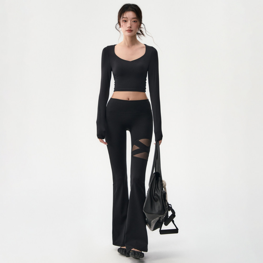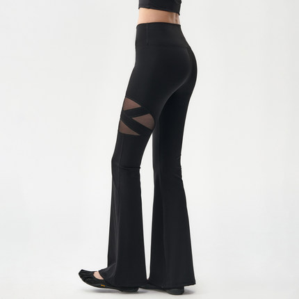新款瑜伽长裤女网纱户外跑步运动裤子普拉提训练服微喇裤健身套装