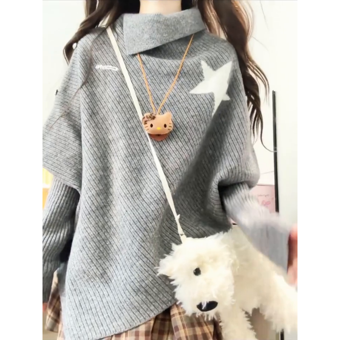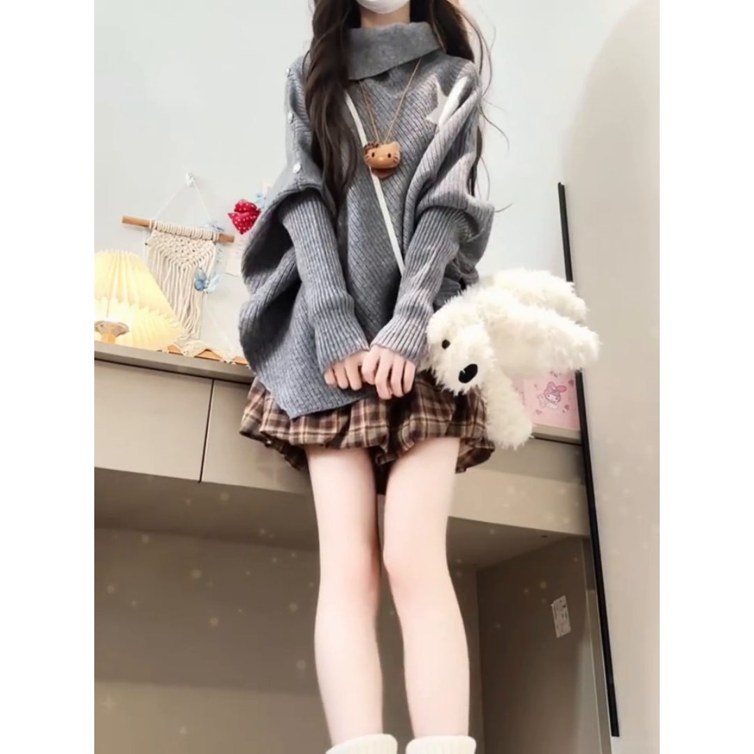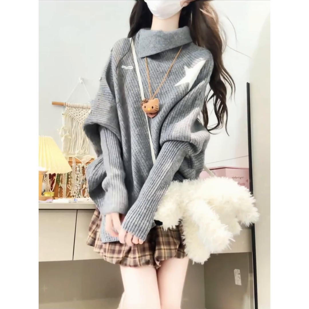 早秋复古慵懒风穿搭不规则斗篷高领针织衫毛衣宽松花苞半身裙套装