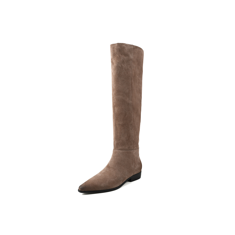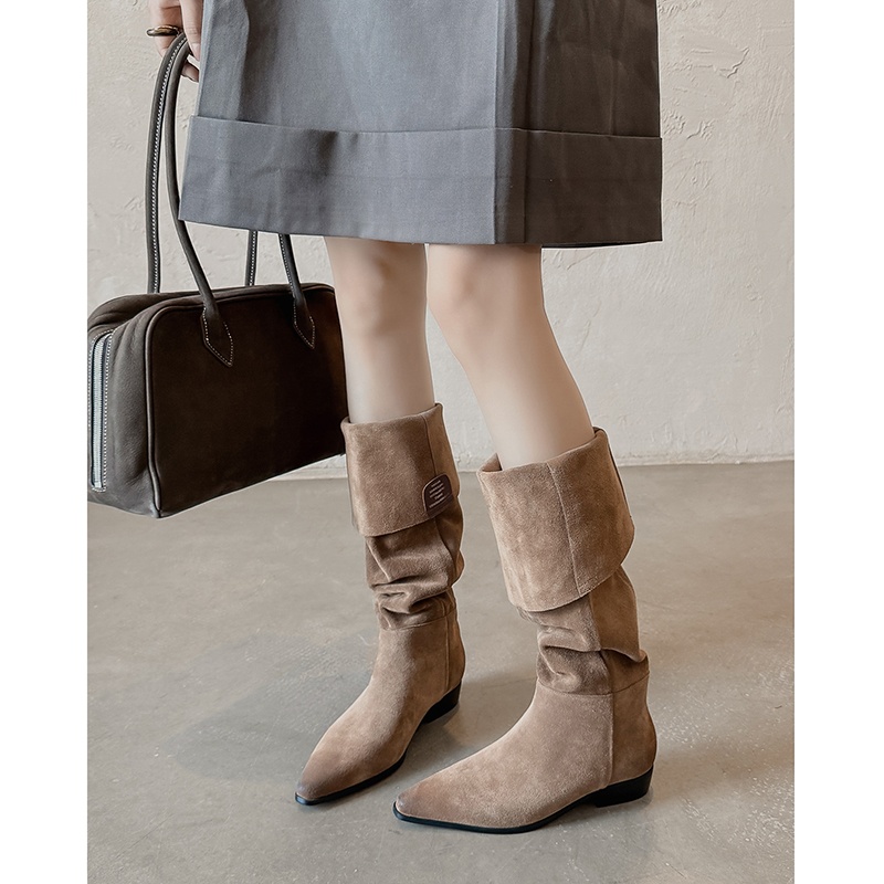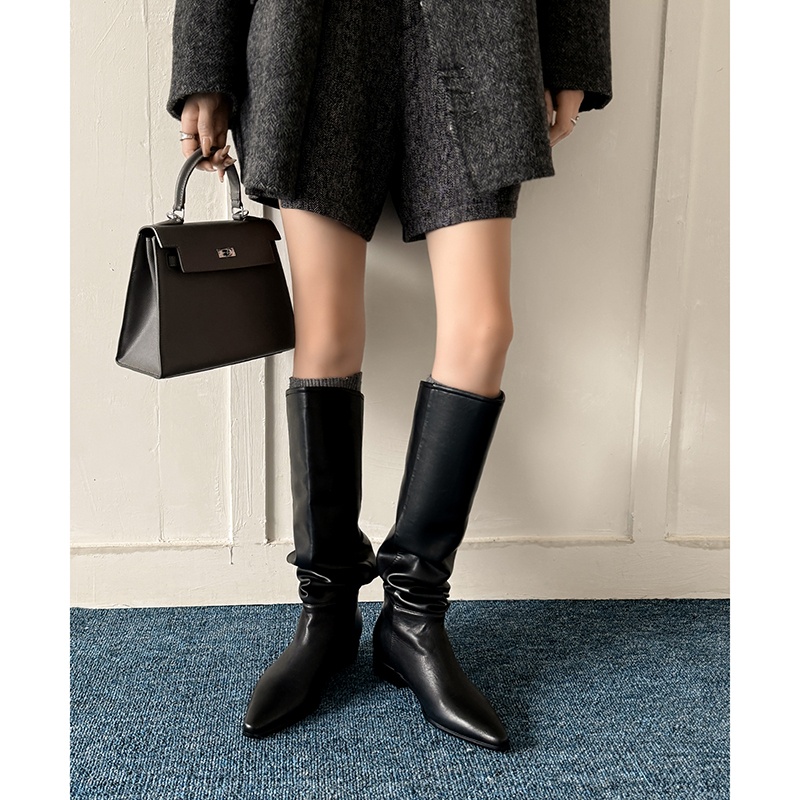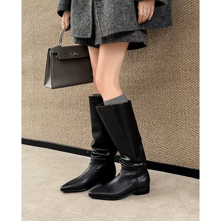 极简风时尚褶皱高筒堆堆靴2025秋冬新款尖头粗跟休闲骑士靴长筒靴