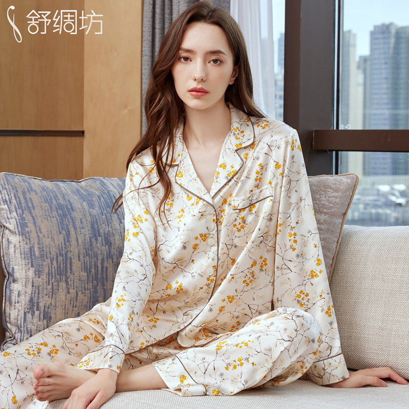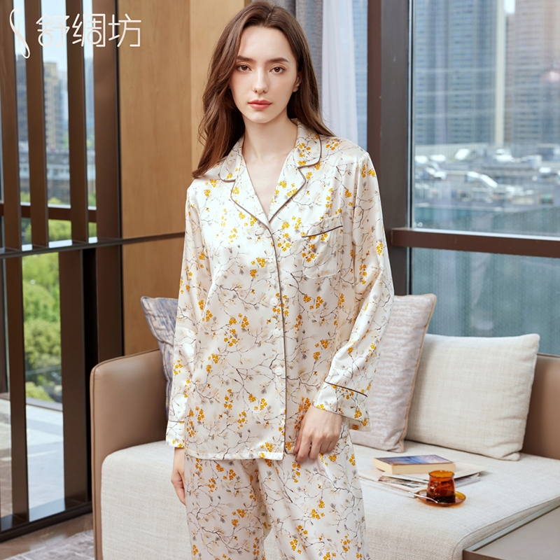 舒绸坊重磅真丝睡衣女士长袖长裤印花大码桑蚕丝绸家居服套装春秋