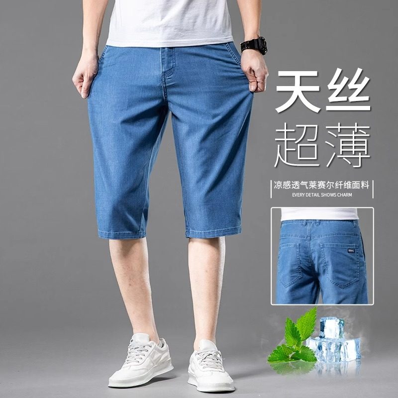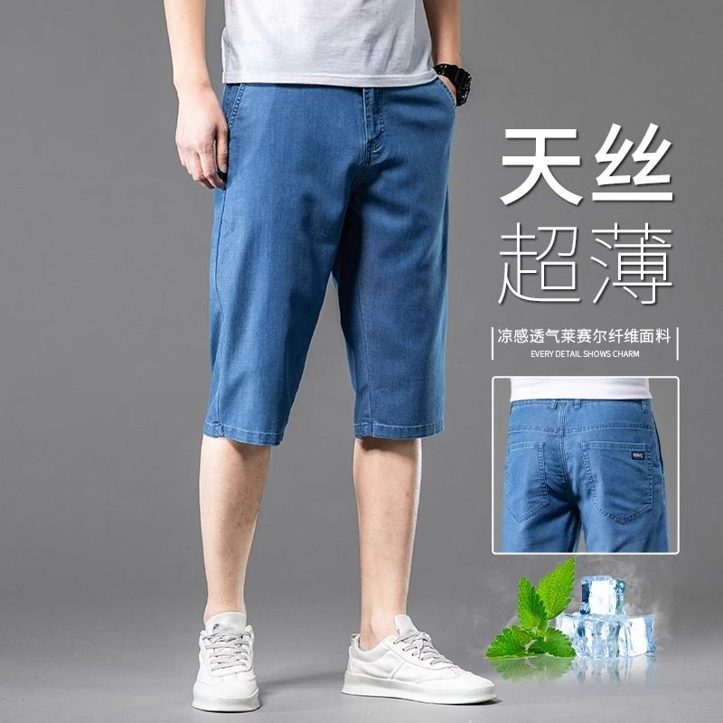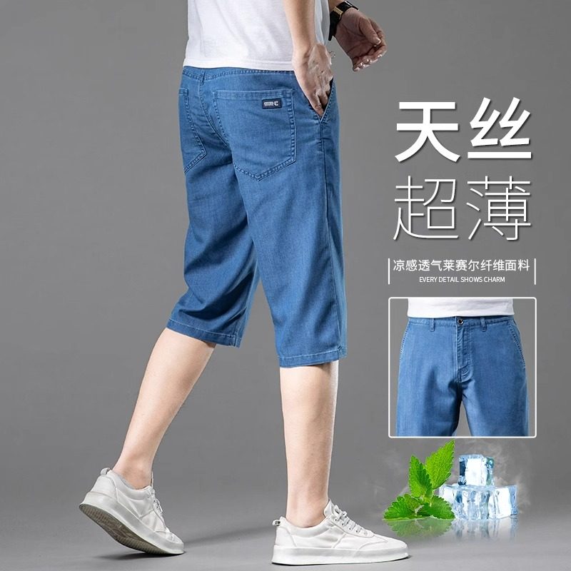 2025夏季冰丝牛仔短裤男天丝超薄款休闲男士中裤宽松直筒七分中裤