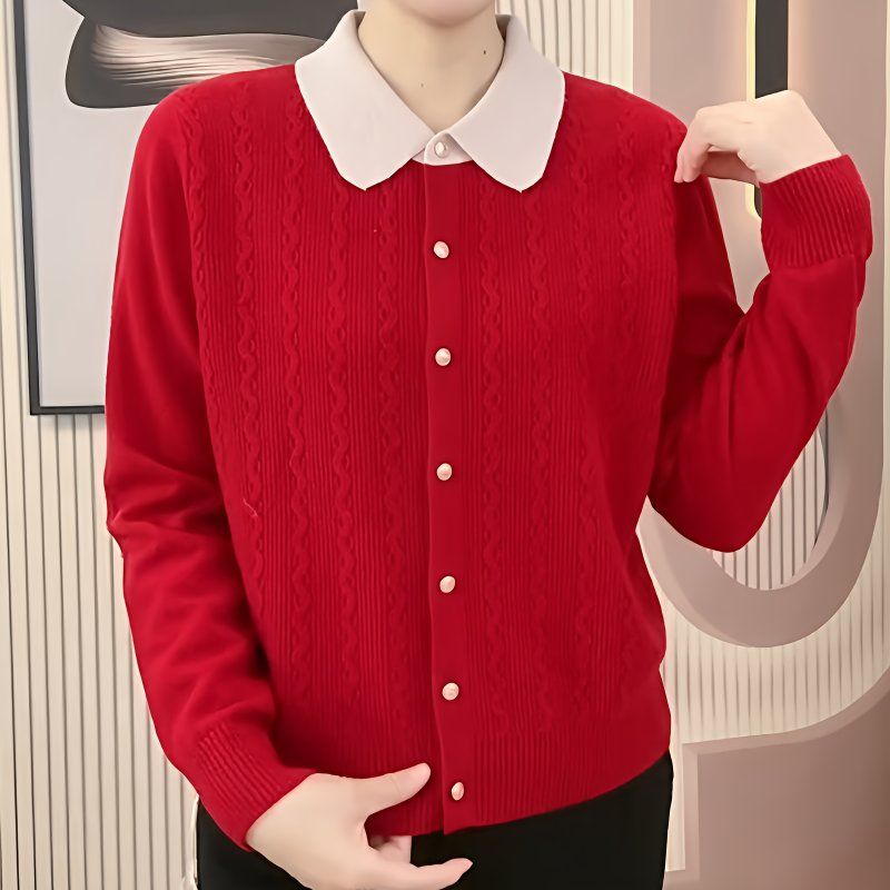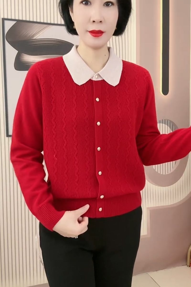 2025春秋新款翻领羊毛衫毛衣女春秋开衫短款大码中年女士针织外套
