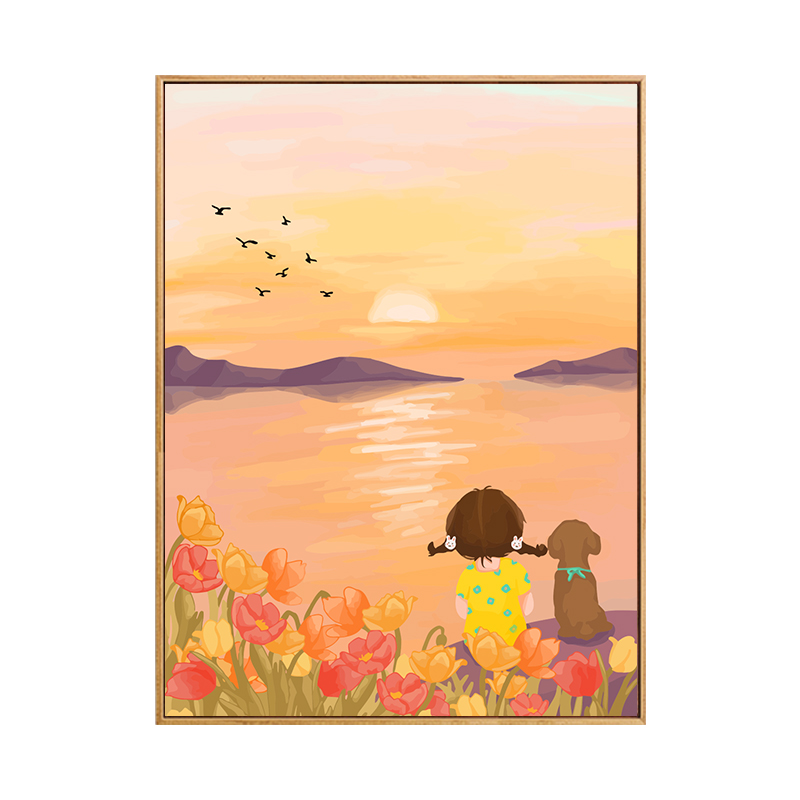 落日黄昏温暖治愈小狗与女孩数字油画diy油彩画向日葵花卉手工画