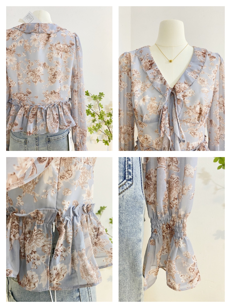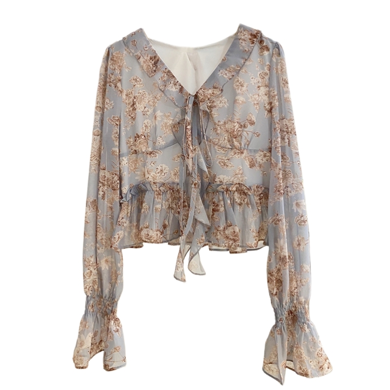 法式V领荷叶边碎花雪纺衫长袖衬衫女春季设计感短款收腰小衫上衣