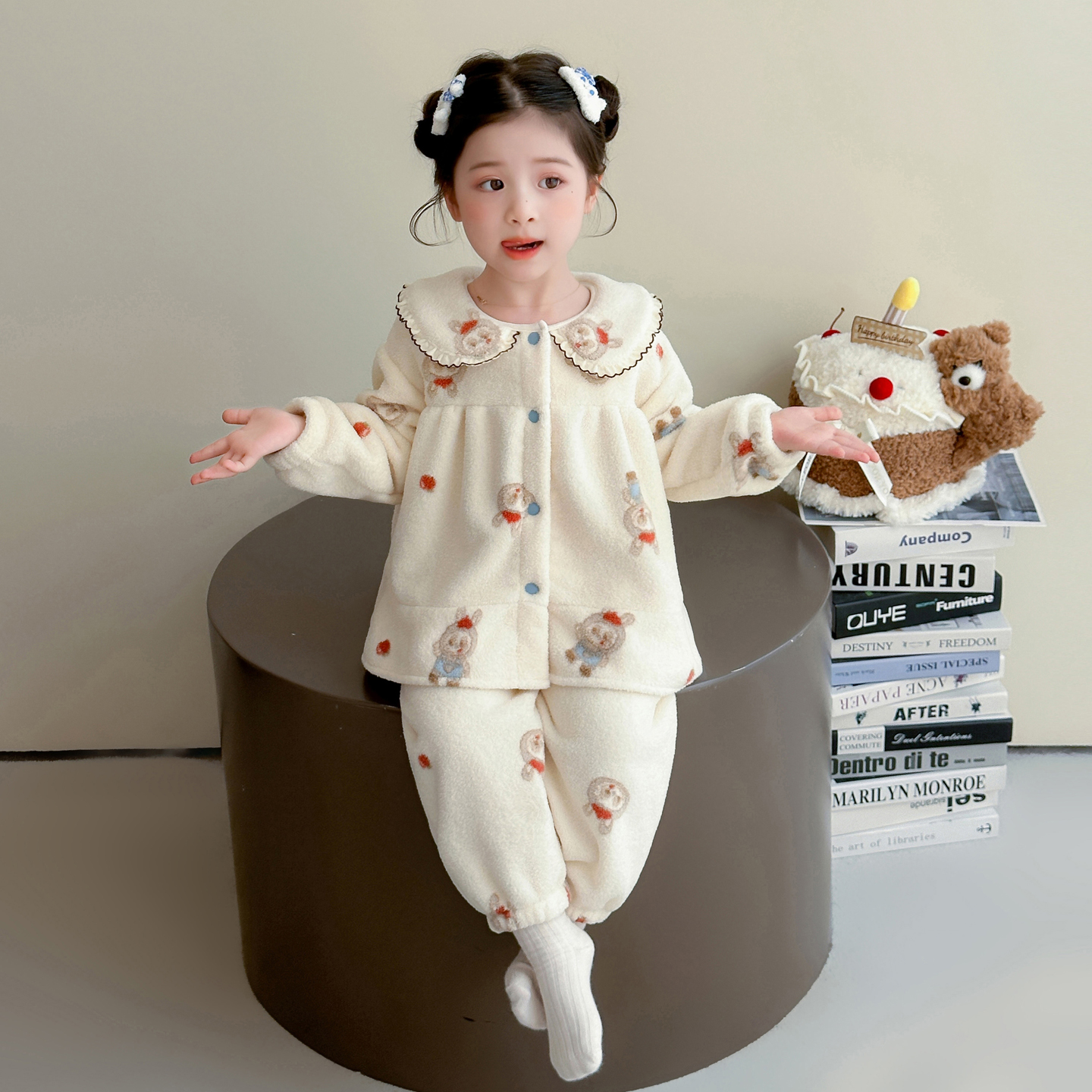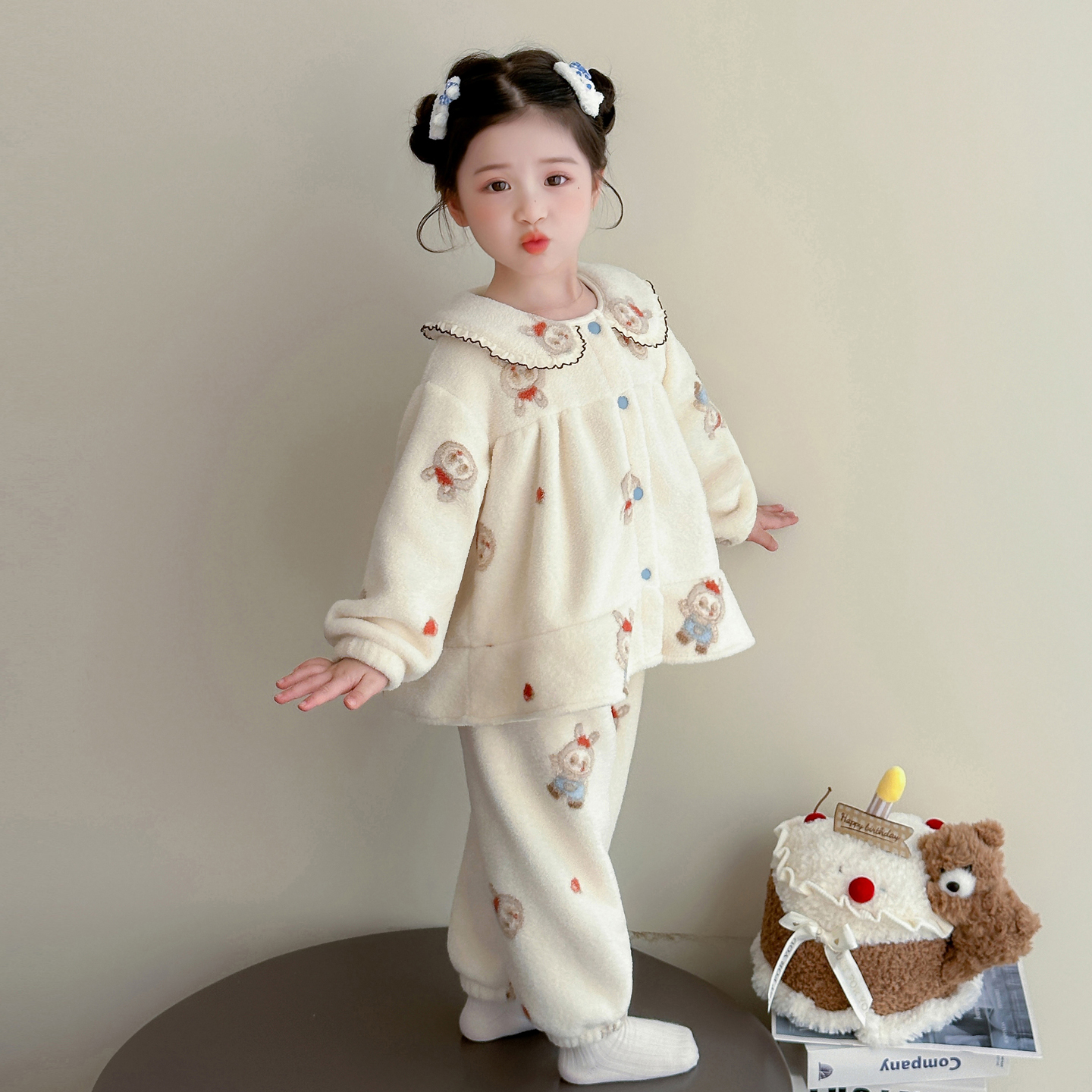 女童珊瑚绒睡衣套装秋冬季2025新款儿童女宝宝加厚保暖家居服开衫