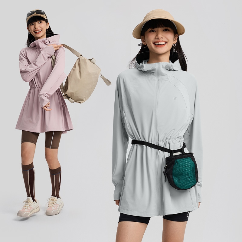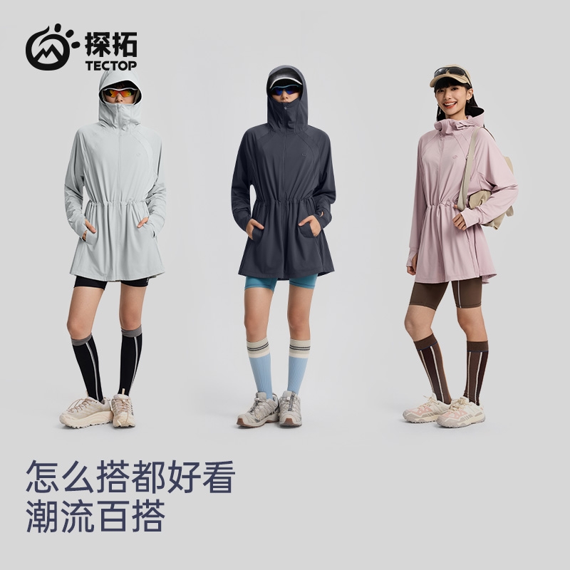 探拓户外中长款防晒衣女冰丝凉感夏季防紫外线收腰连帽运动服外套