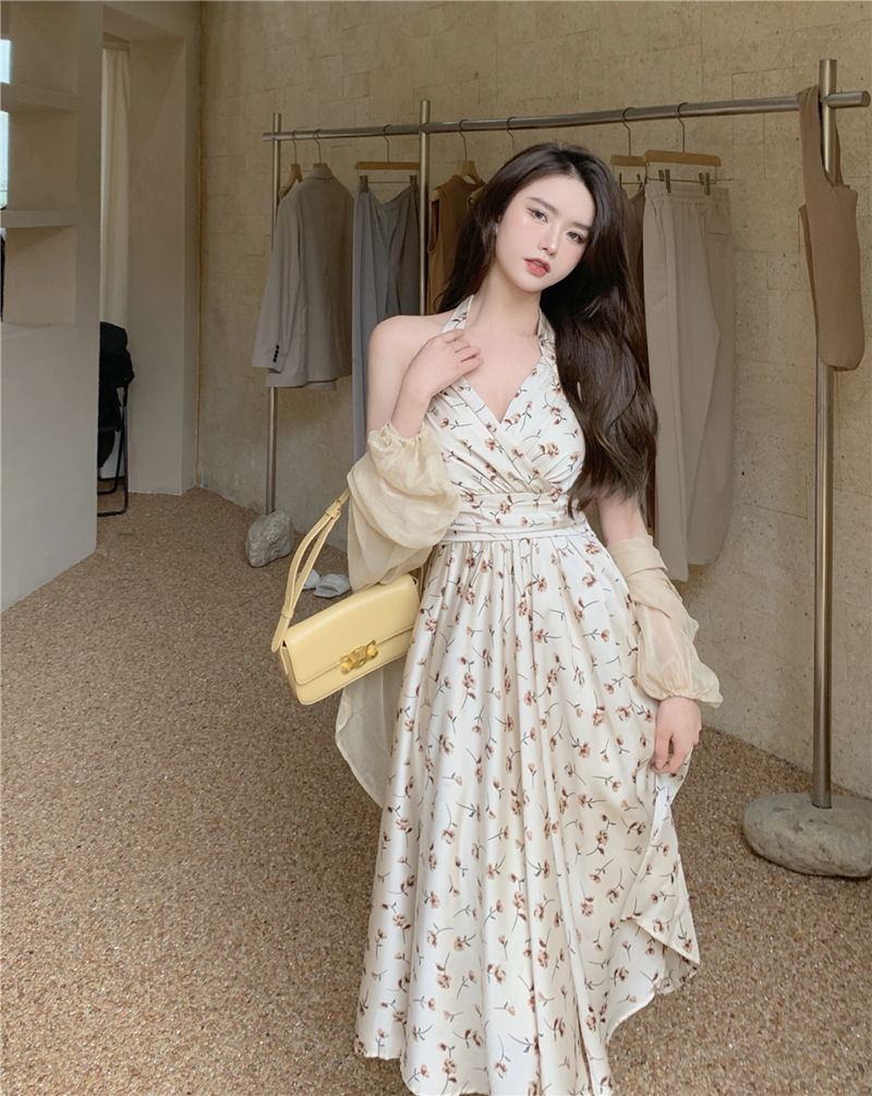 纯欲风多巴胺显瘦挂脖碎花新款防晒开衫长袖春夏季吊带连衣裙子女