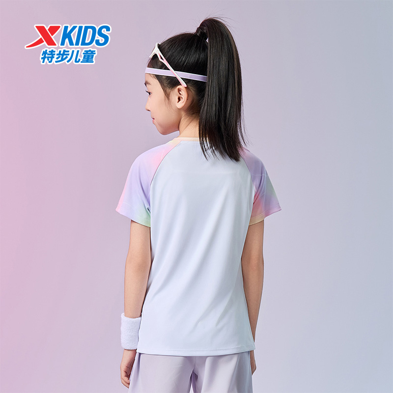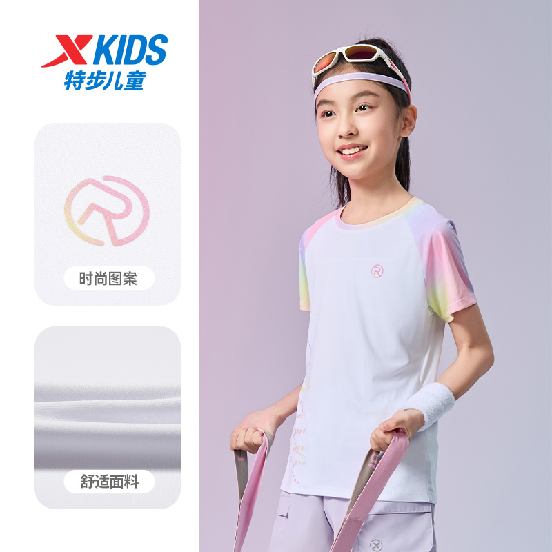 氢风|特步女童拼接速干短T儿童短袖上衣2025夏季新款大童夏装女孩
