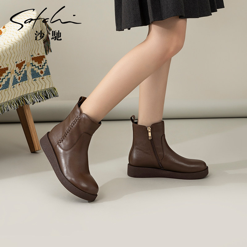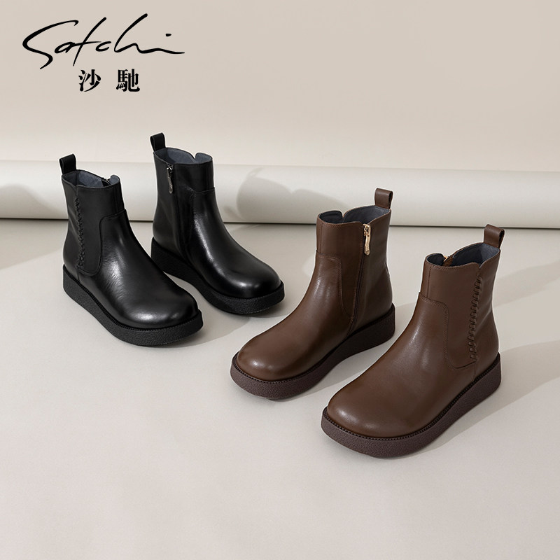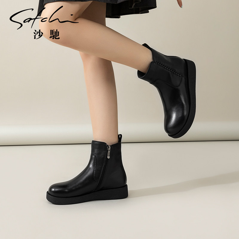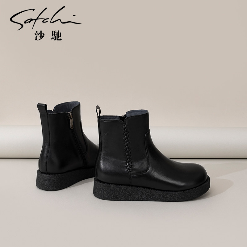 沙驰女鞋厚底加绒短靴保暖女靴2025冬季新款牛皮软皮靴子切尔西靴