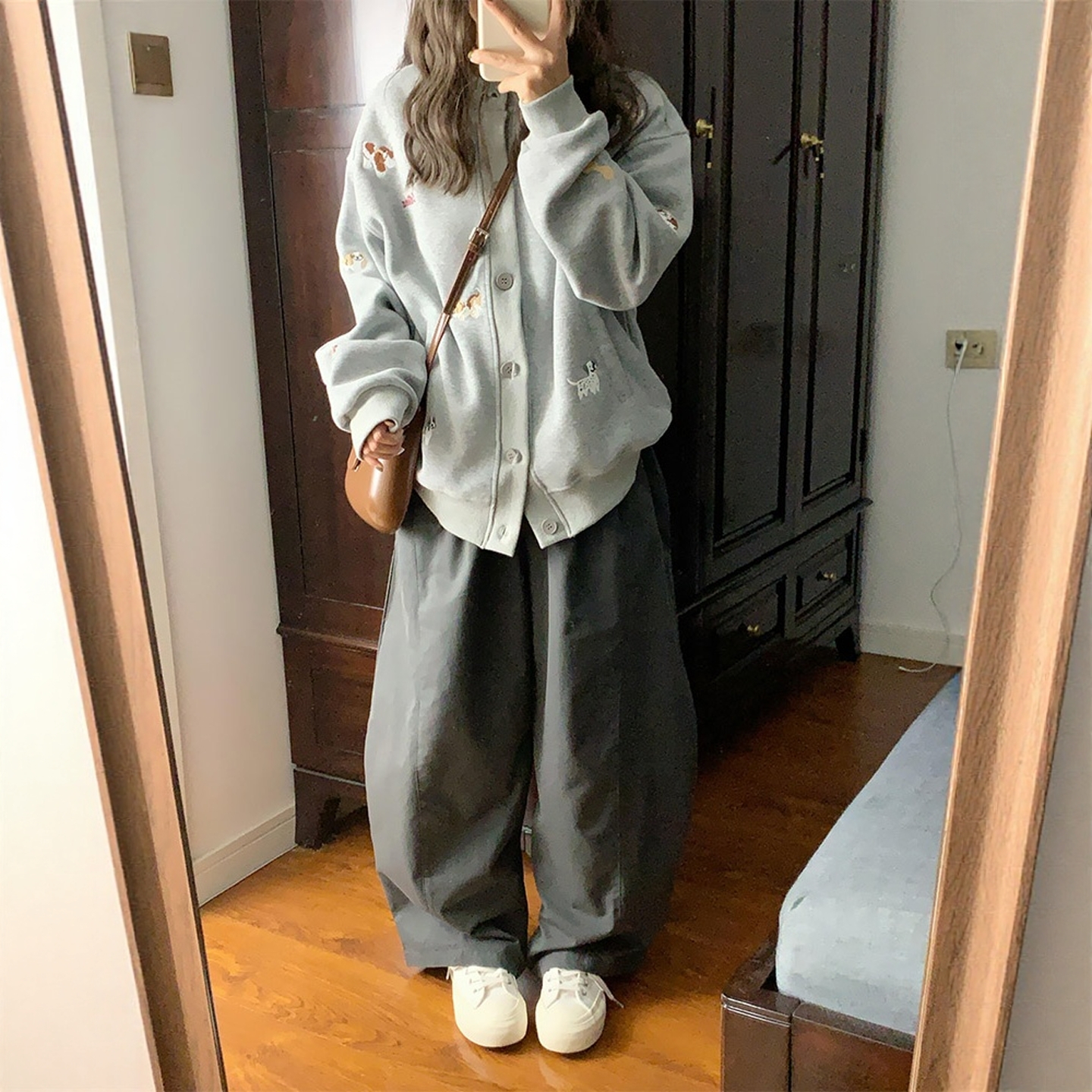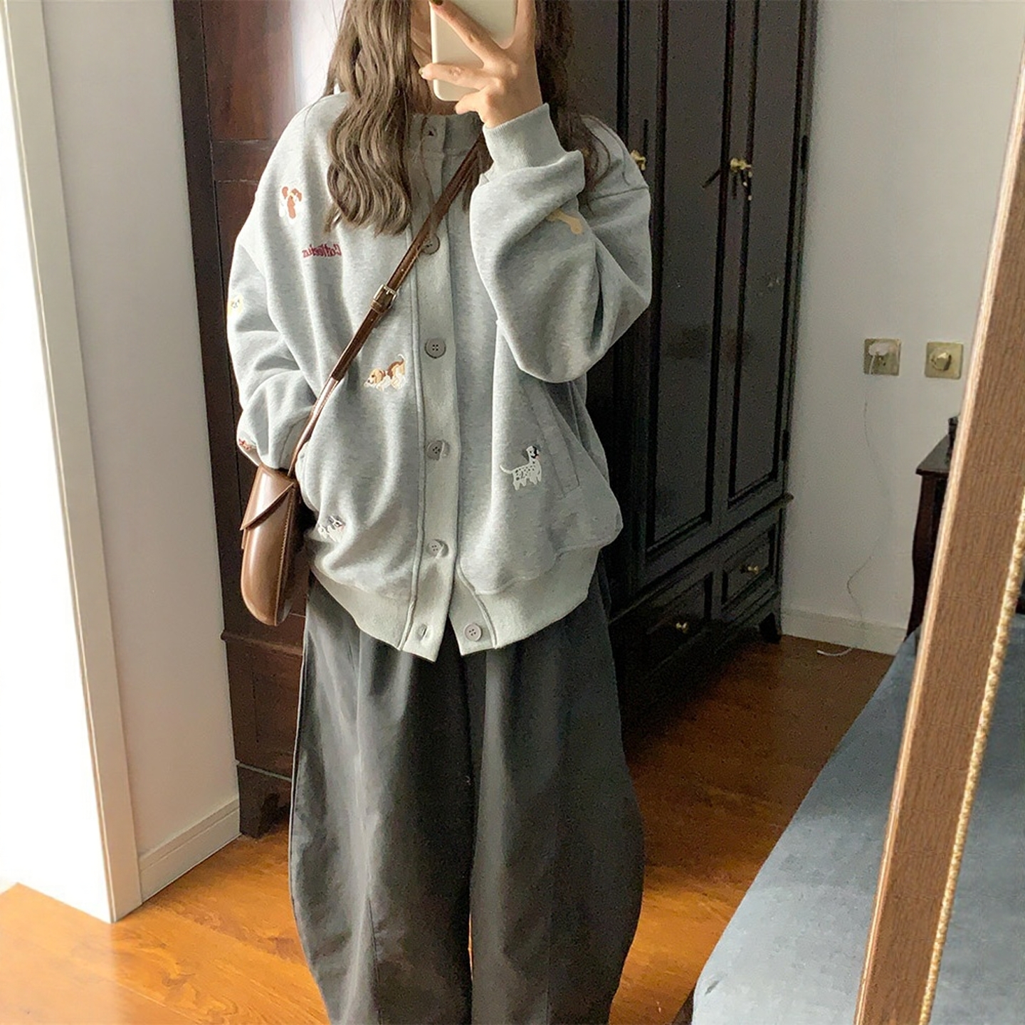 学院风复古刺绣小狗灰色卫衣外套女秋冬季宽松慵懒风开衫外搭上衣