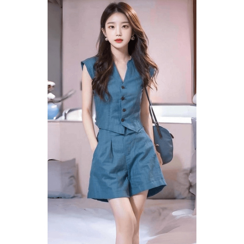 夏装搭配一整套今年流行的女装蓝色V领纯色无袖马甲短裤气质套装