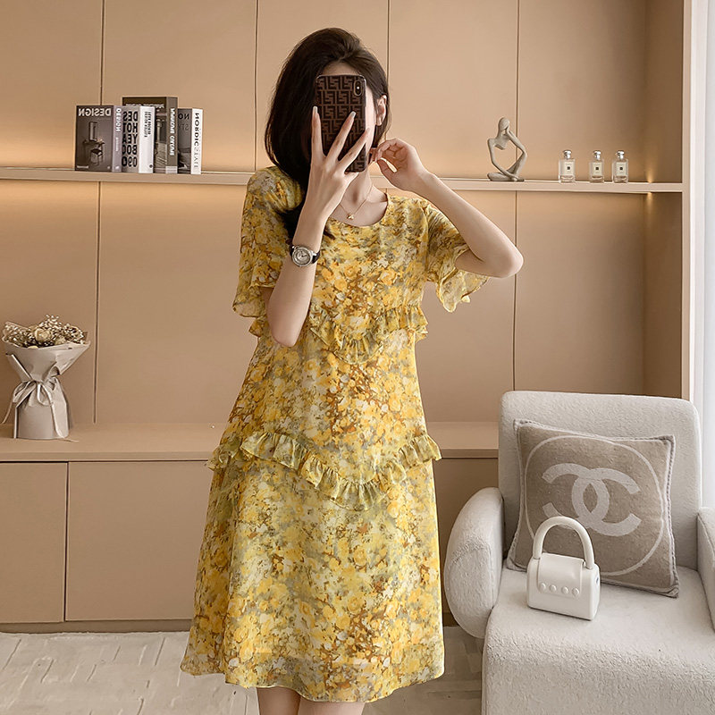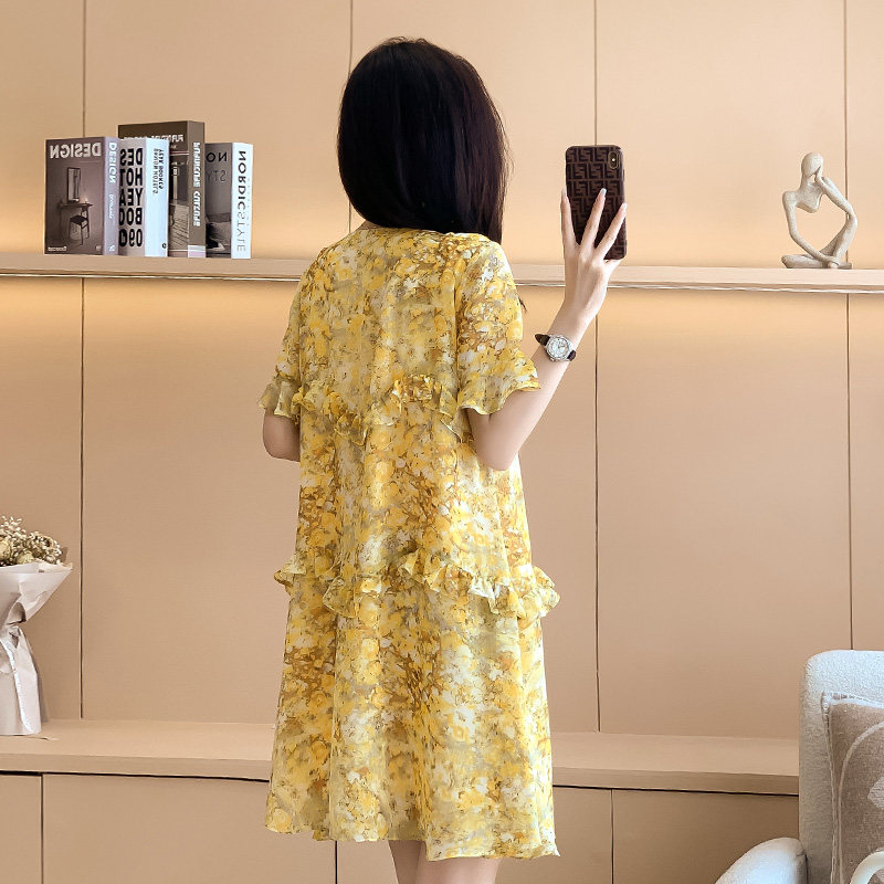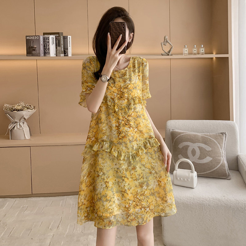 夏季新款碎花连衣裙短袖宽松显瘦荷叶边印花高级感小个子A字短裙