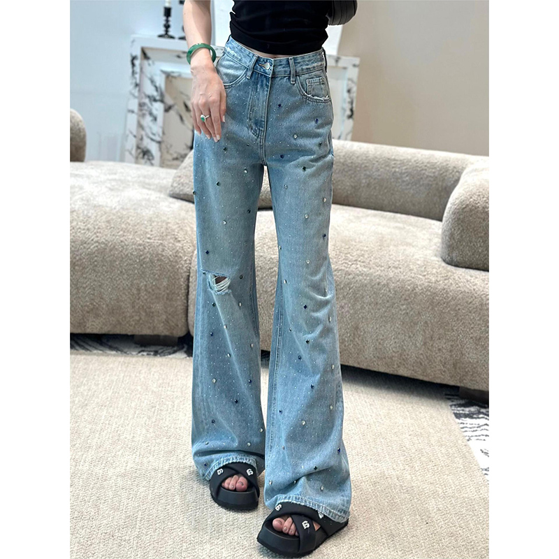 高级感烫钻微喇牛仔裤女破洞裤秋