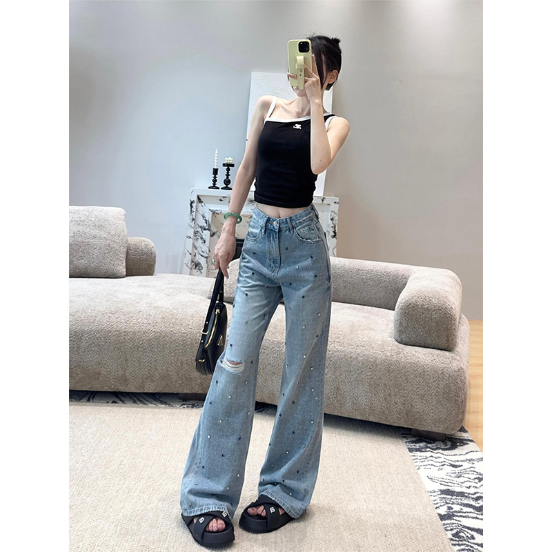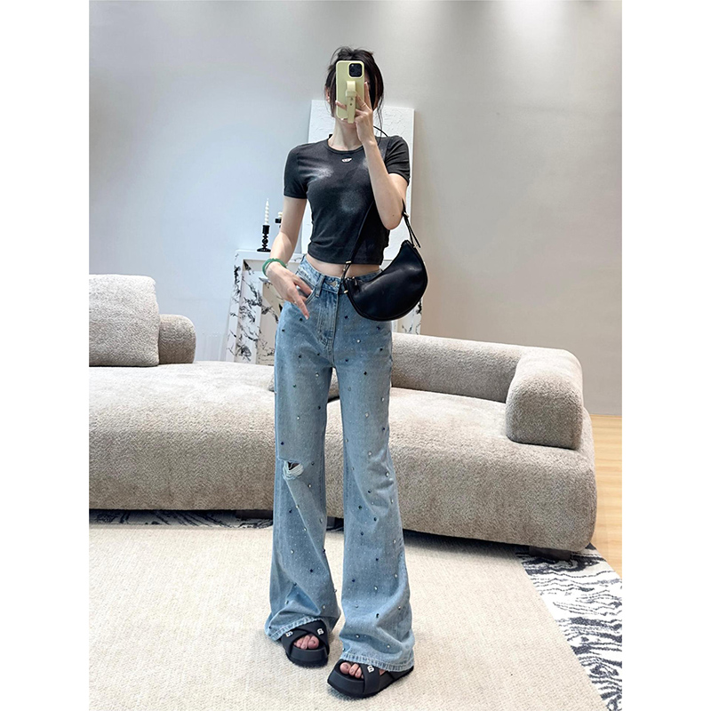 高级感烫钻微喇牛仔裤女2025秋季新款破洞裤高腰宽松显瘦阔腿裤