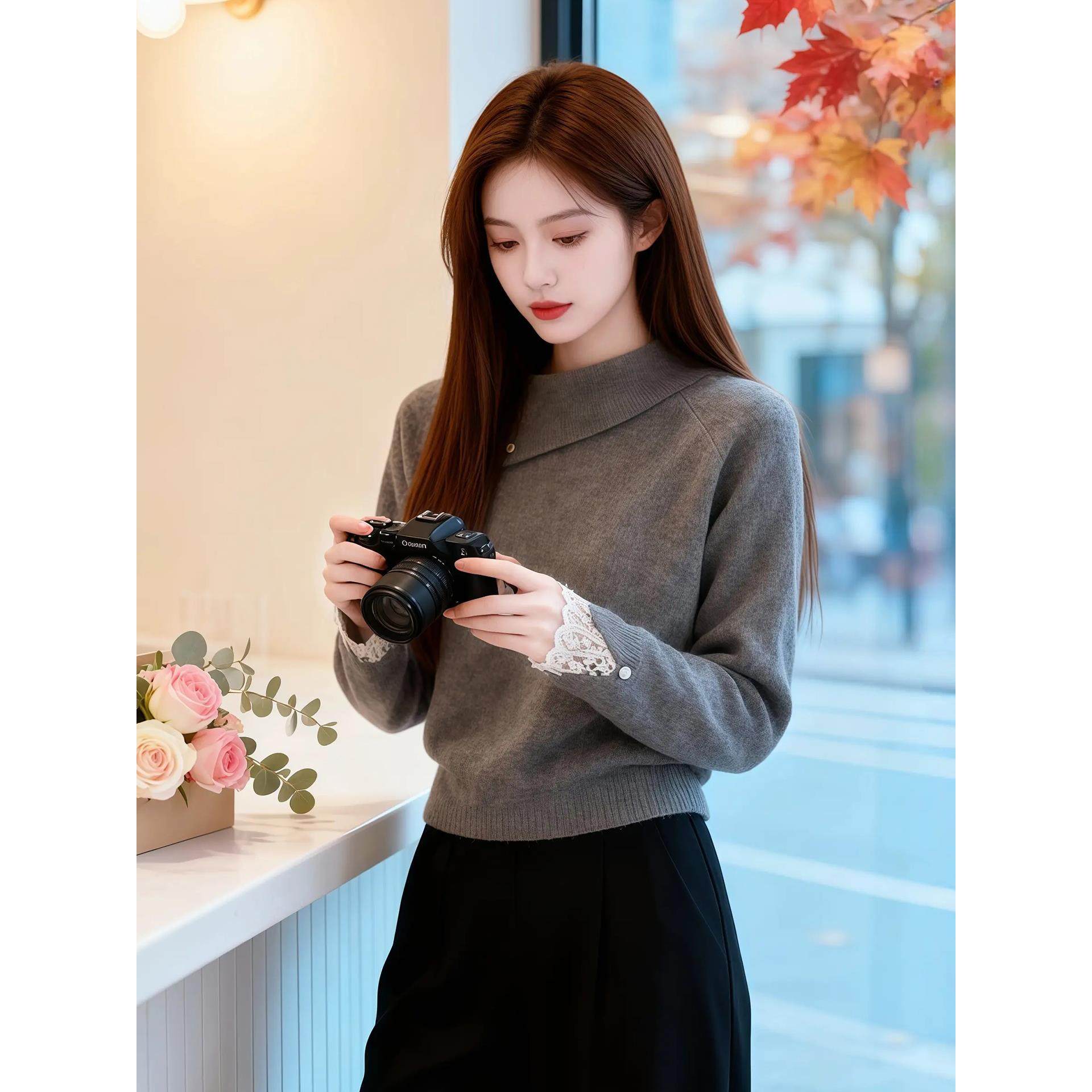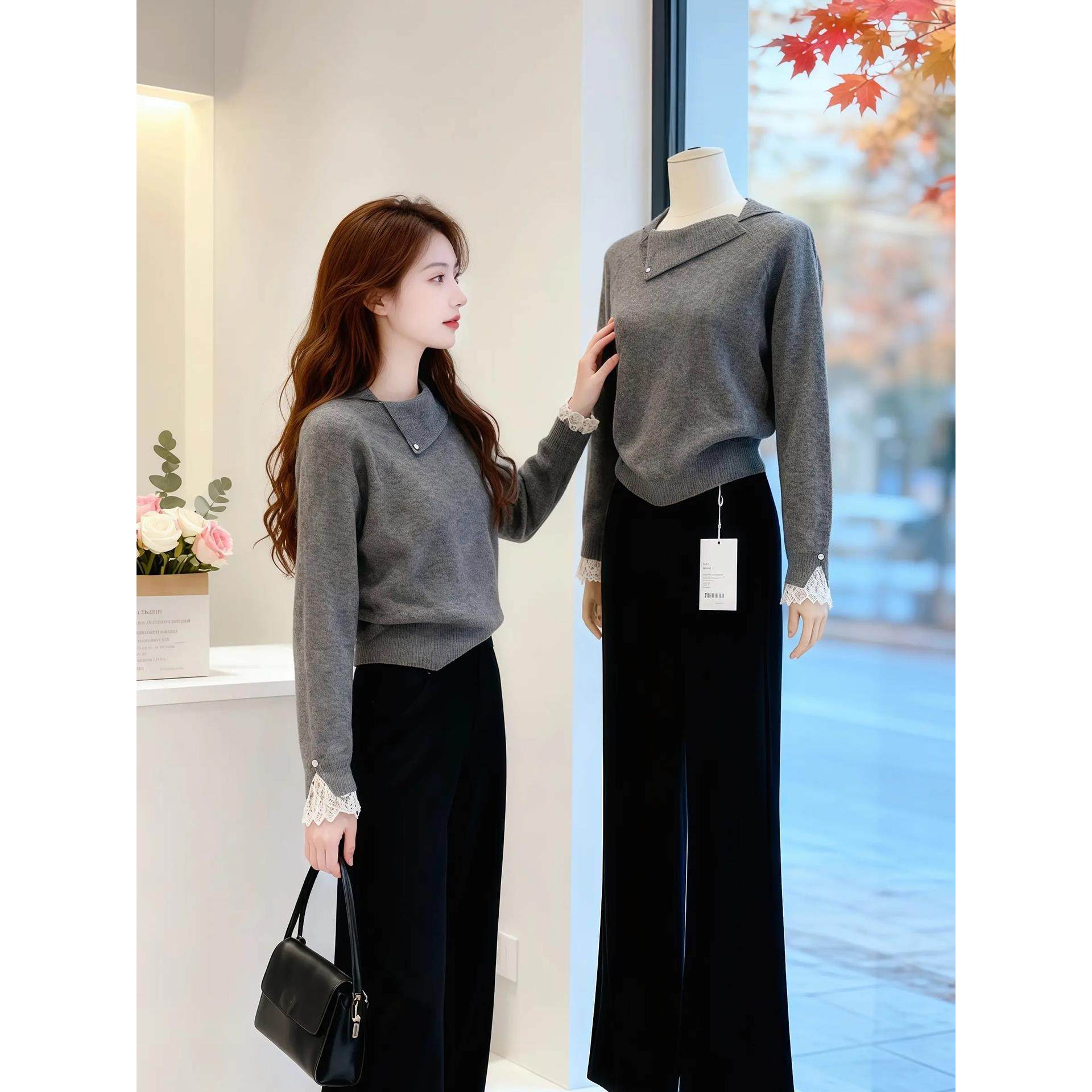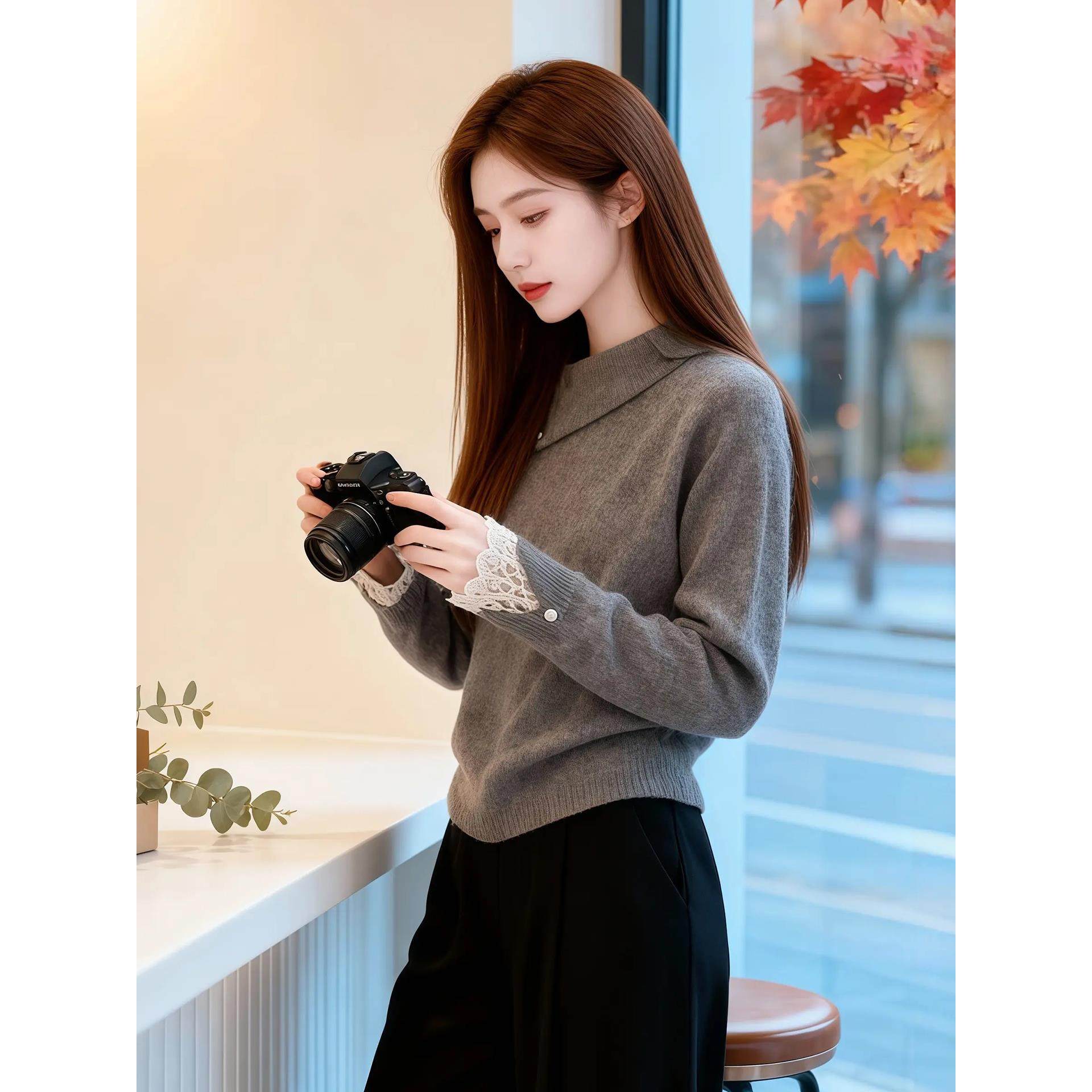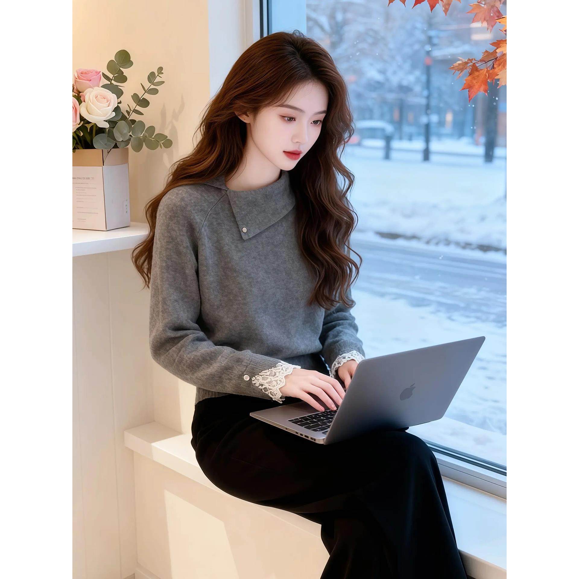 灰色翻领设计感毛衣2025冬季百搭气质针织衫羊绒长袖蕾丝拼接上衣