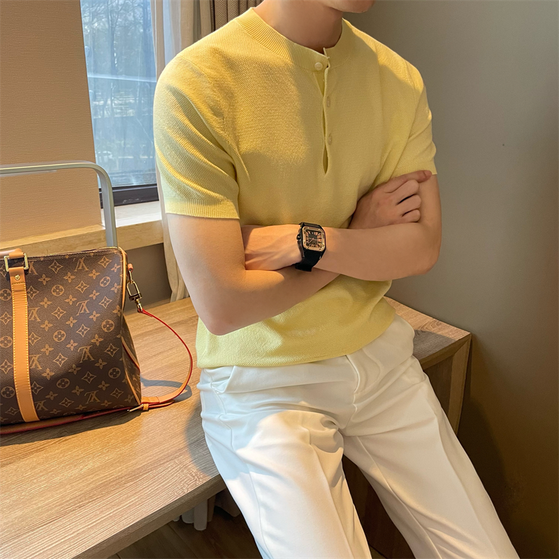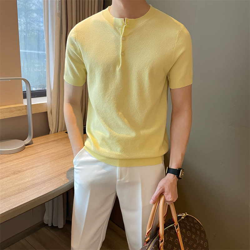 夏季短袖扣式原宿风格针织T恤蜂窝纹轻薄透气休闲套头复古男毛衣t