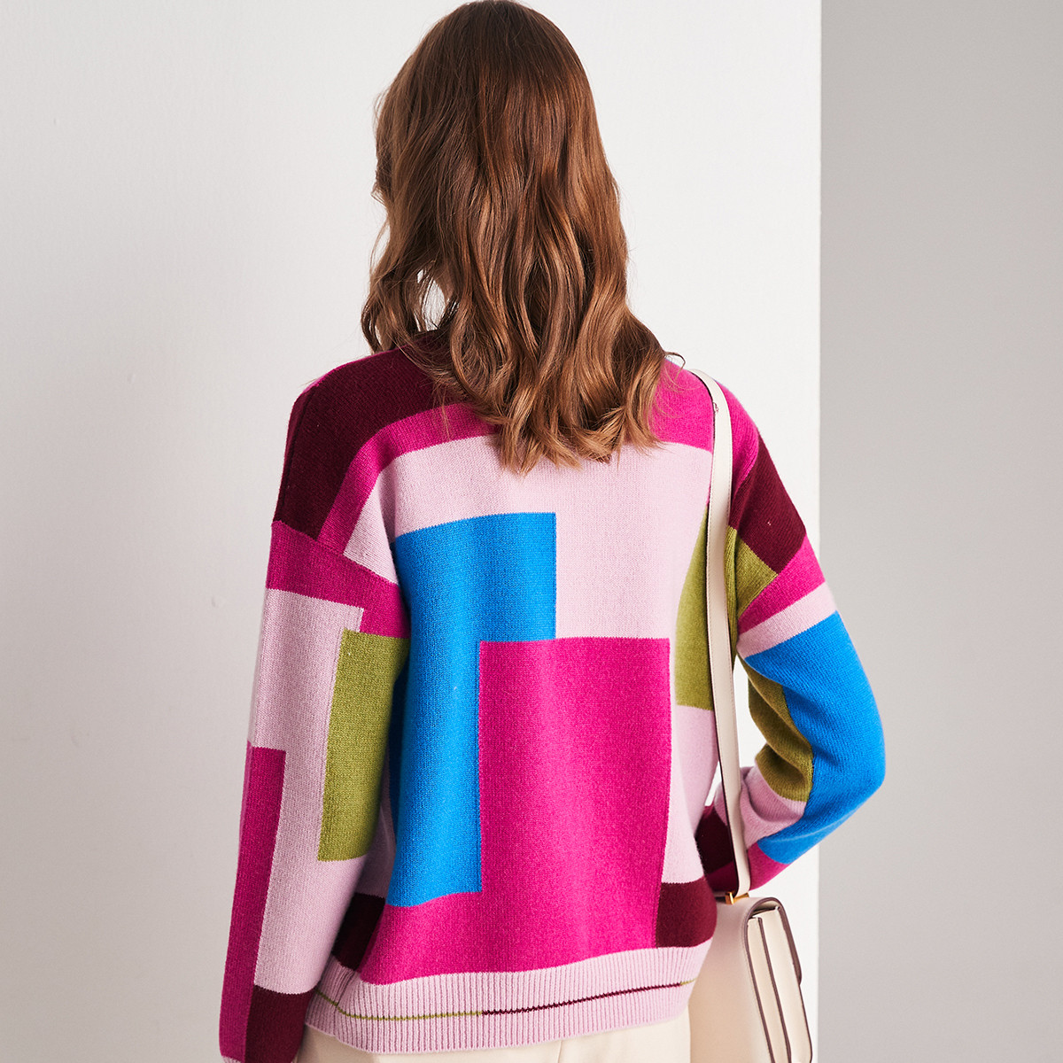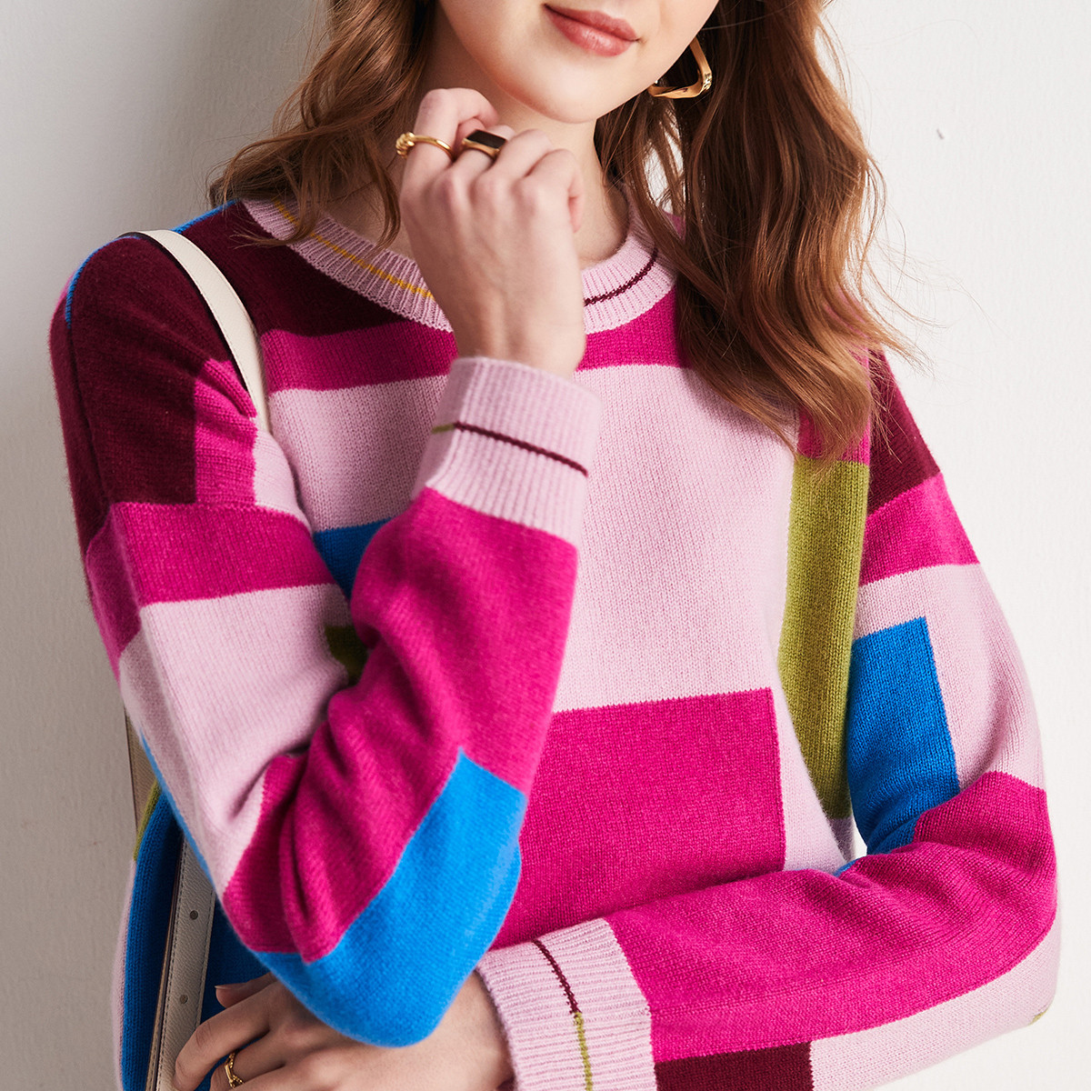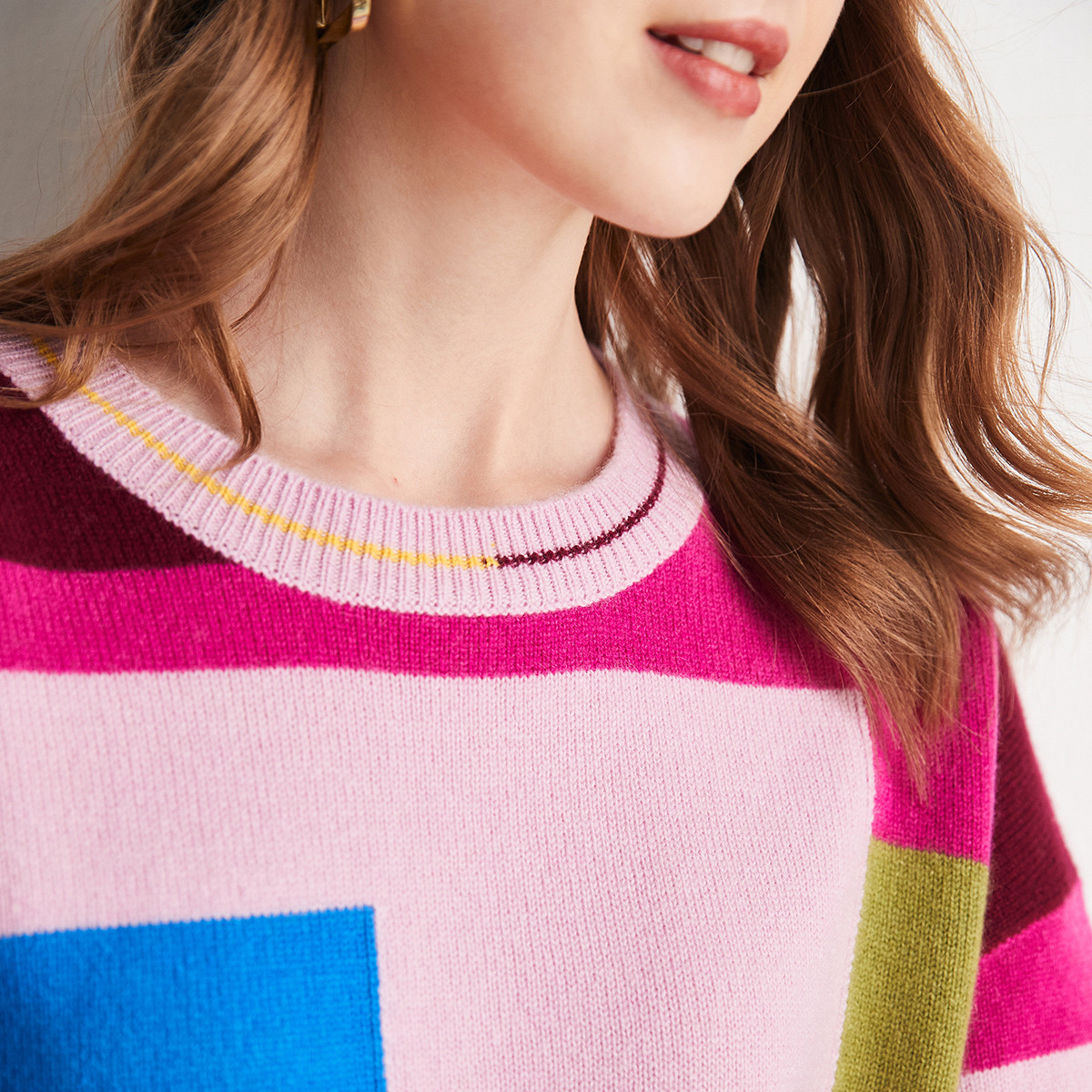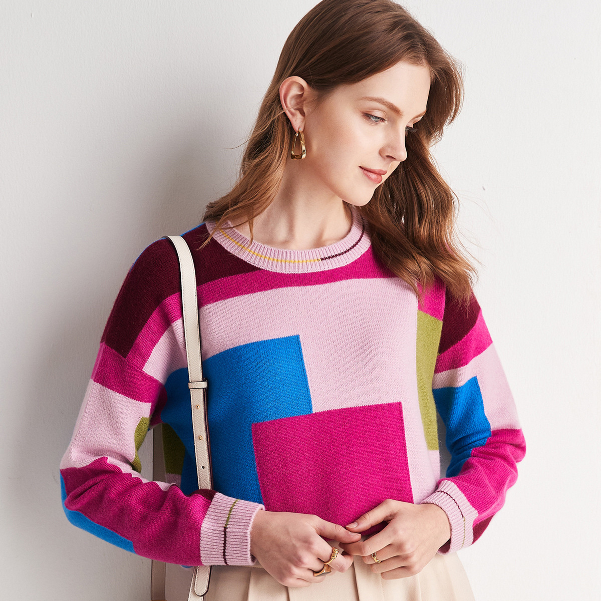 帕罗100%山羊绒23秋冬新款圆领长袖拼色提花毛衣针织套头羊绒衫女