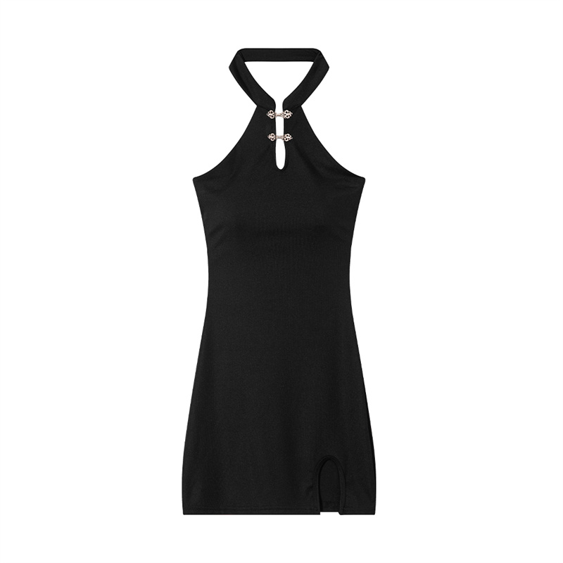 CROW CAIM 2024夏季新款 中式无袖盘扣挂脖露背连衣裙