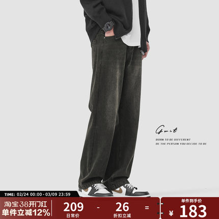 GWIT 美式高街复古重磅石磨水洗春秋长裤炭黑休闲潮牌牛仔裤男
