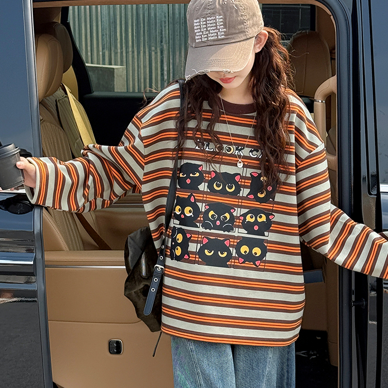 女童冬装长袖T恤2025新款儿童休闲条纹卫衣女大童加绒加厚打底衫