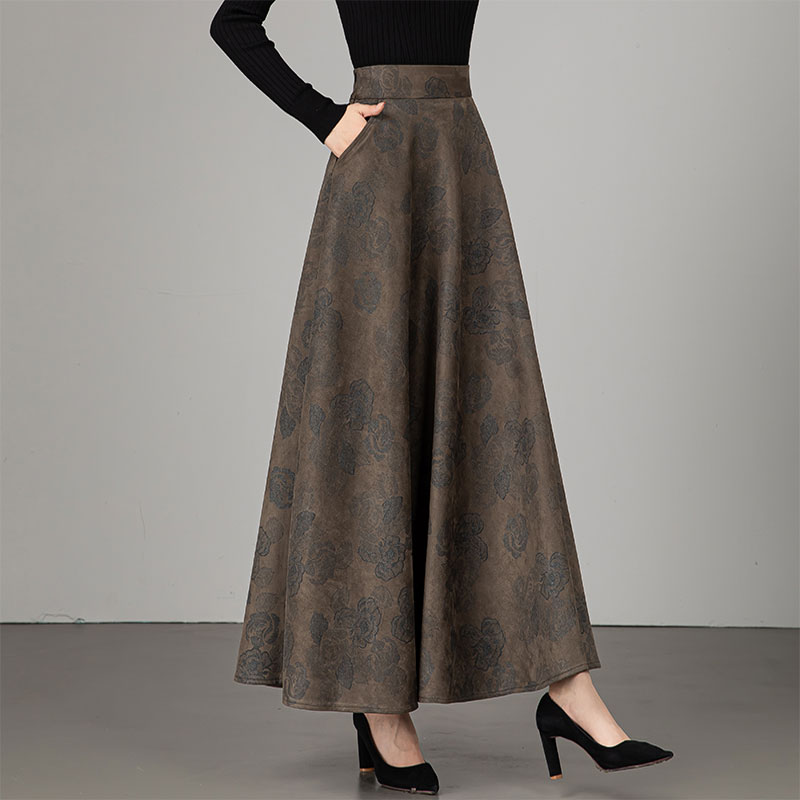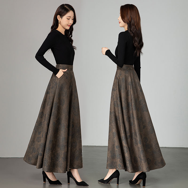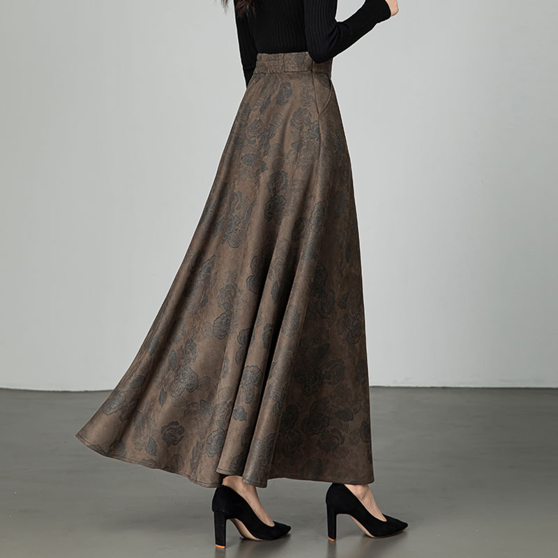 2025秋冬新款复古印花半身裙女高腰大码伞裙显瘦大摆舞裙a字长裙