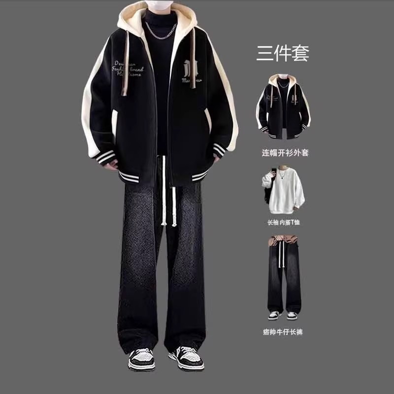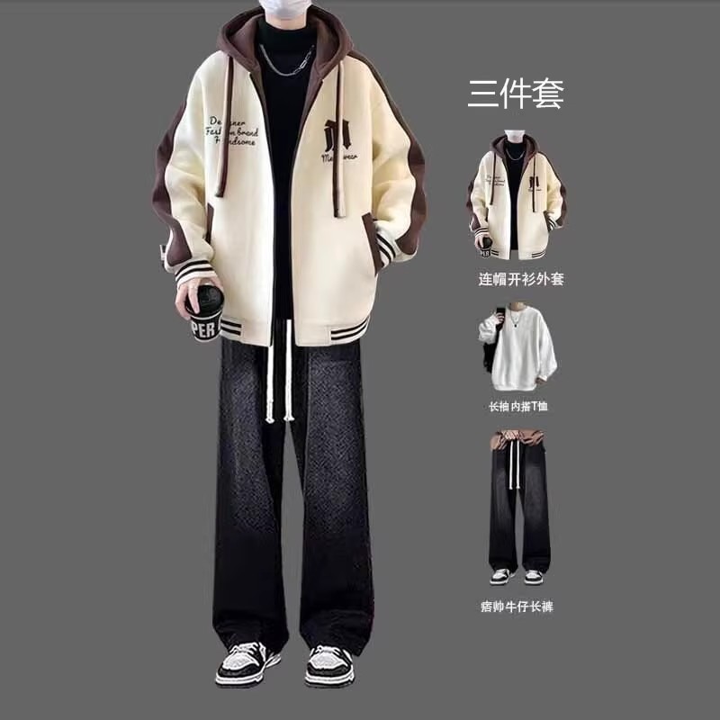 美式棒球服外套男春秋季连帽开衫卫衣夹克男生套装穿搭三件套潮流