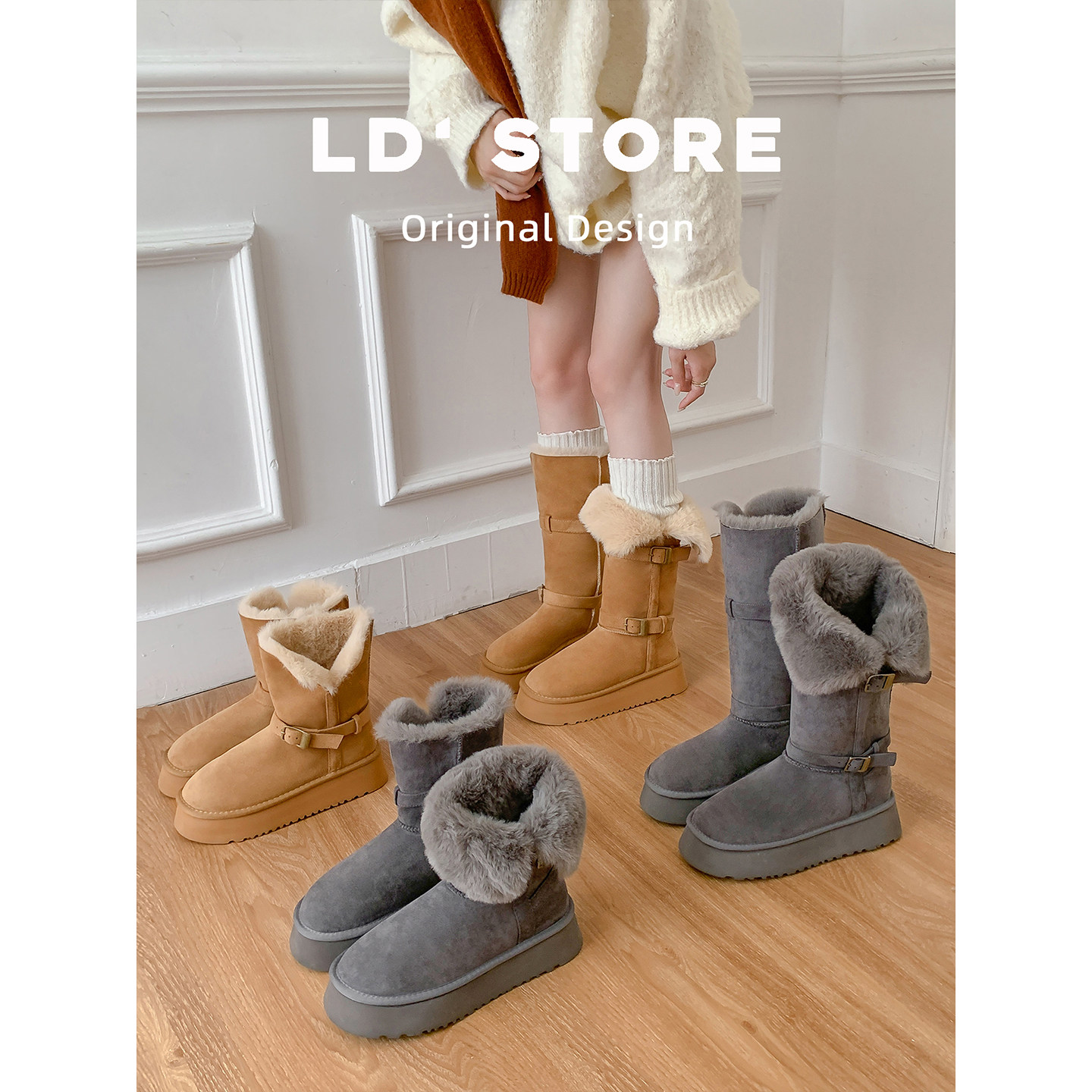 厚底灰色雪地靴长筒2025新款冬季内增高中筒加绒保暖东北高筒棉鞋
