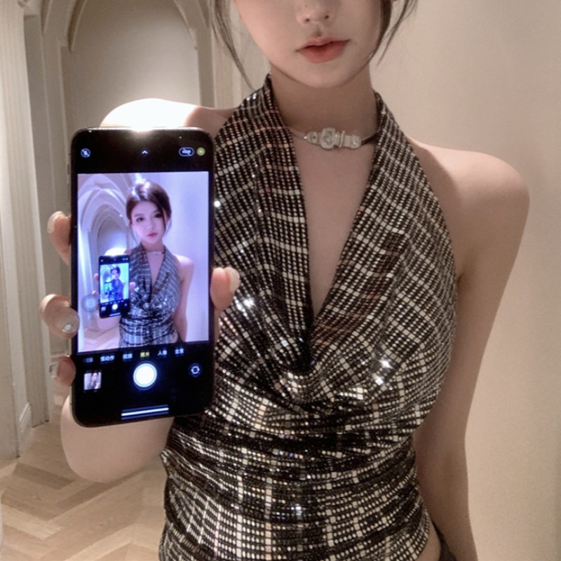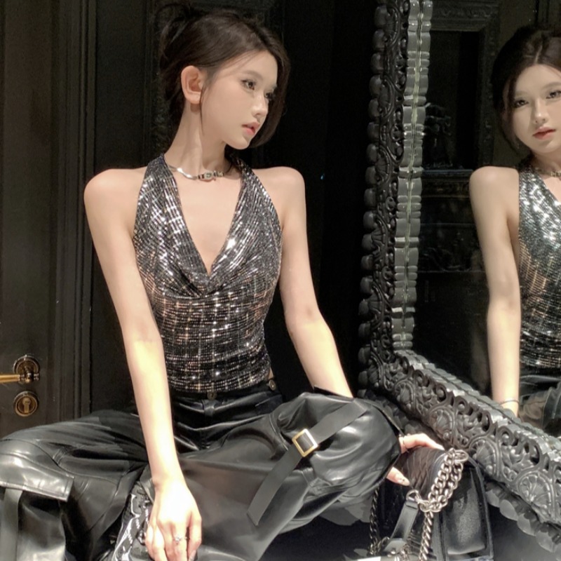 胖妹妹大码女装设计感亮钻V领挂脖上衣春季韩版修身显瘦打底背心