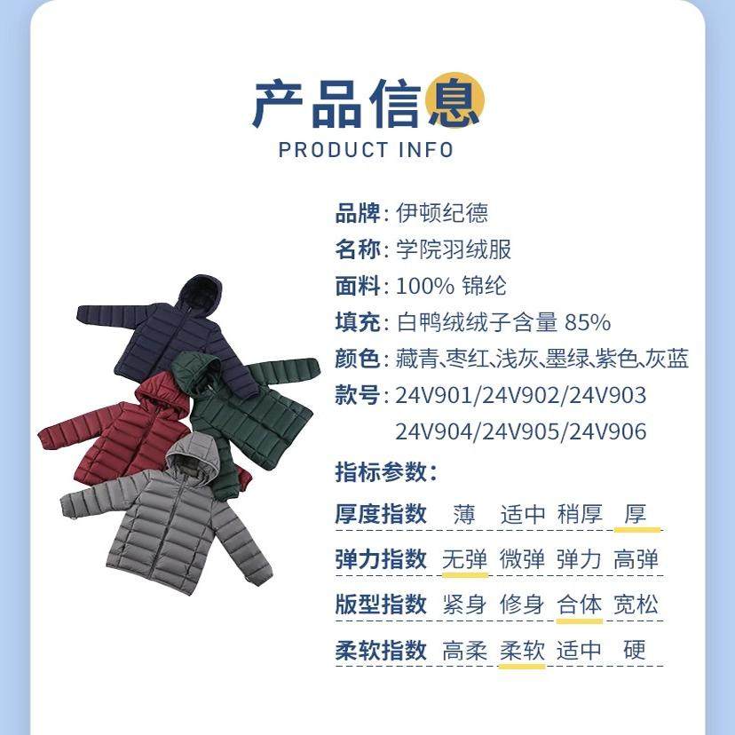 伊顿纪德校服儿童羽绒服内胆男女童冬季轻薄羽绒服外套85%白鸭绒