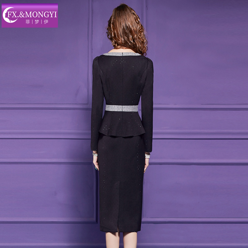 菲梦伊镶钻黑色连衣裙女长袖秋季新款荷叶边方领收腰高端包臀裙子
