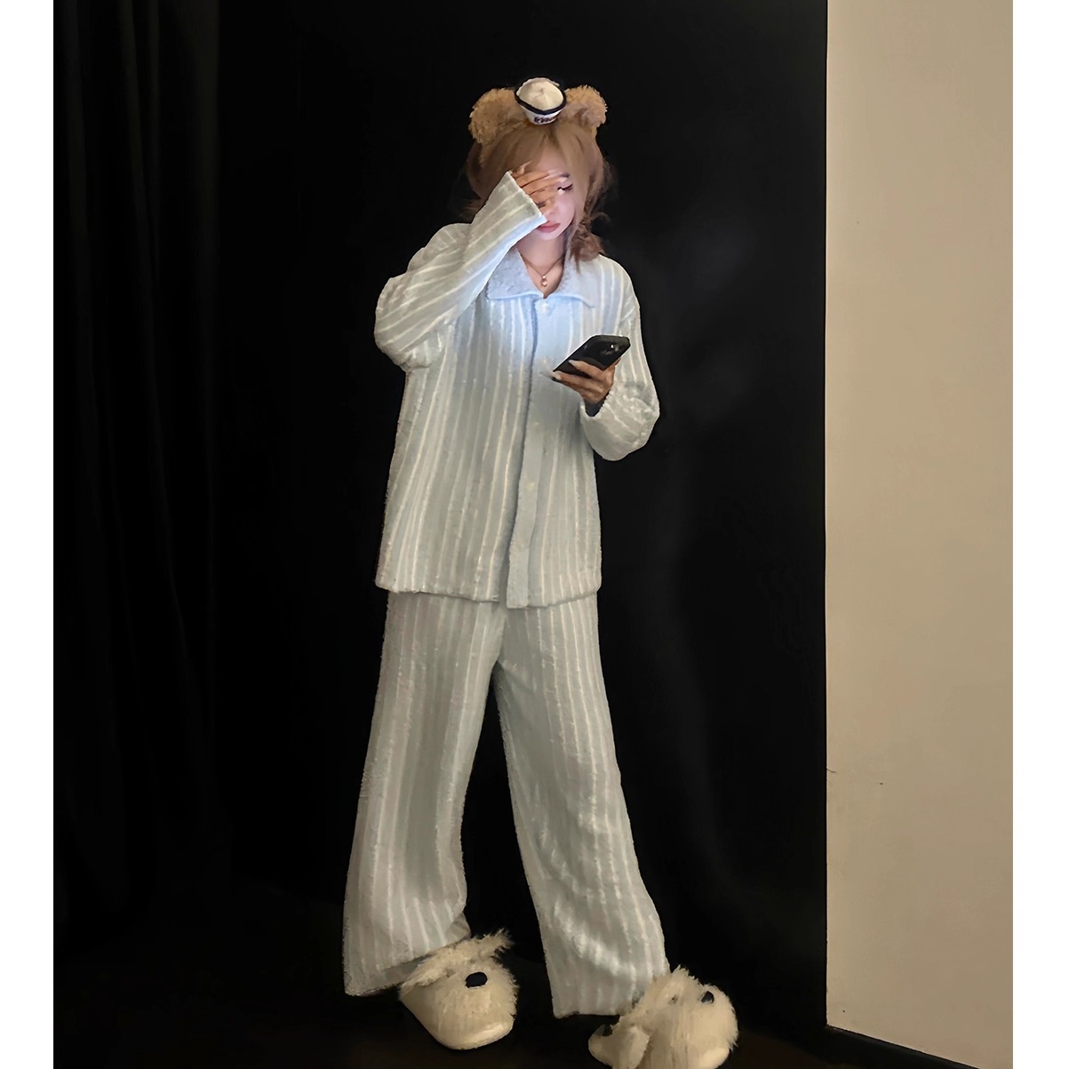 温柔甜美半边绒睡衣女款新款冬季加厚宽松休闲毛绒针织家居服套装