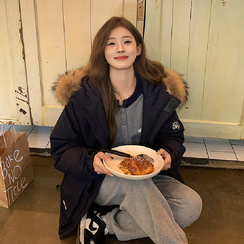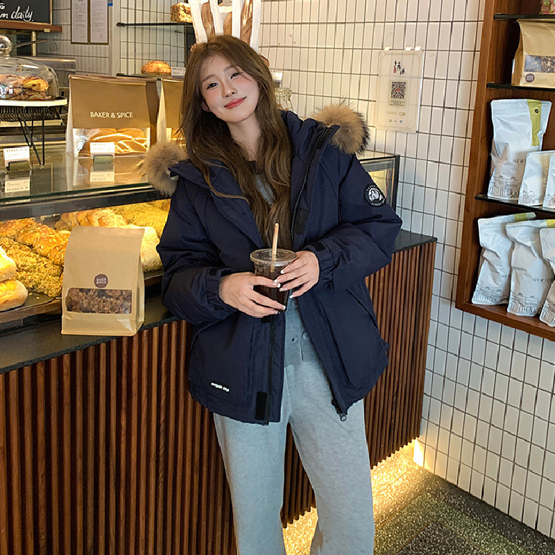 大码女装藏青色复古加厚夹棉连帽外套女胖mm美式慵懒风派克服棉服
