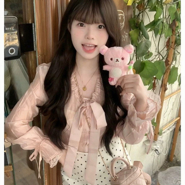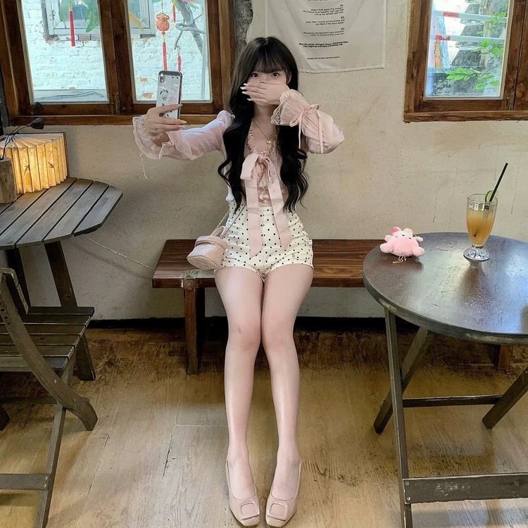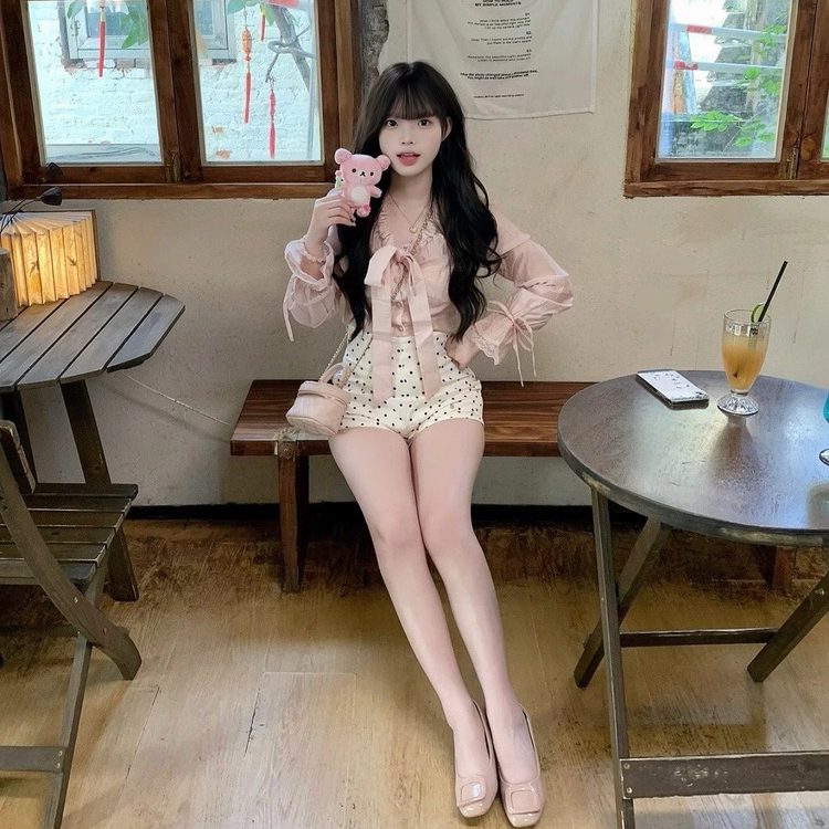早秋季法式甜美温柔粉色V领花边蝴蝶结衬衫+波点高腰短裤两件套女