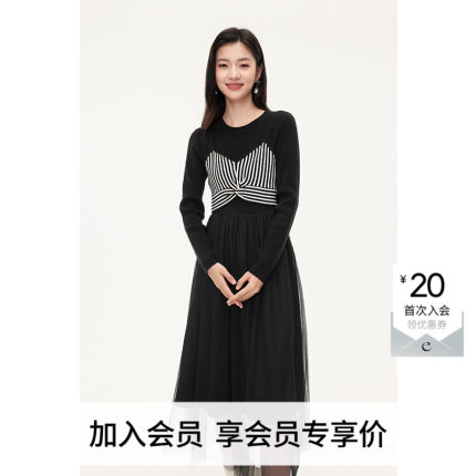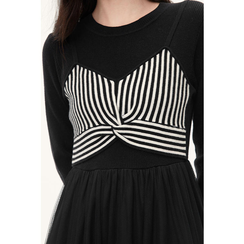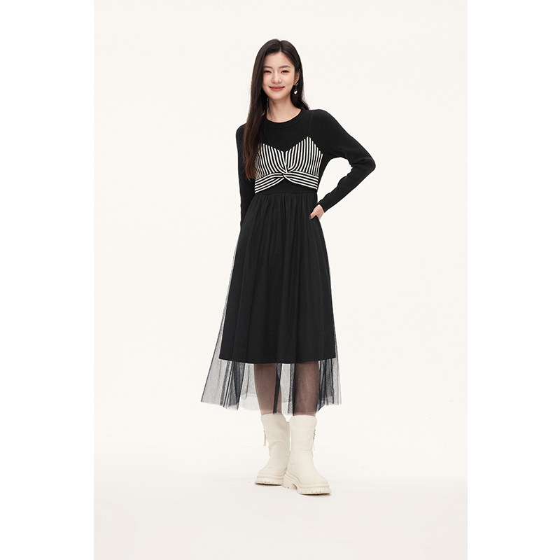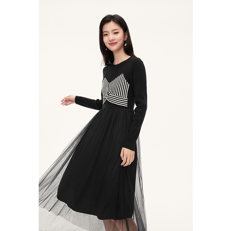 【商场同款】诗凡黎针梭拼连衣裙2023冬新款黑色纱裙女3EA493191