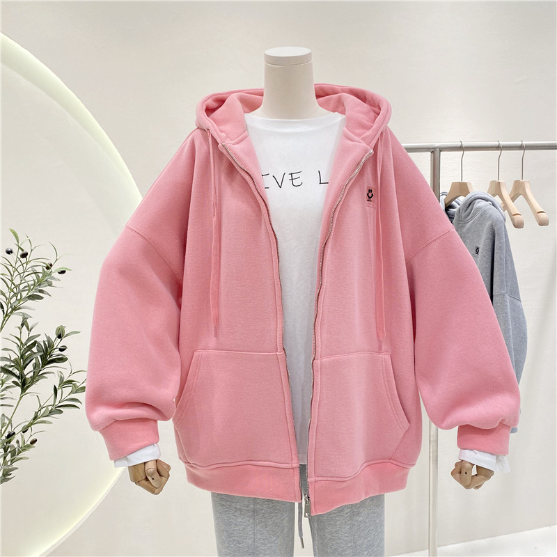 加绒加厚纯色刺绣笑脸宽松慵懒风bf大码带帽拉链卫衣女百搭外套潮