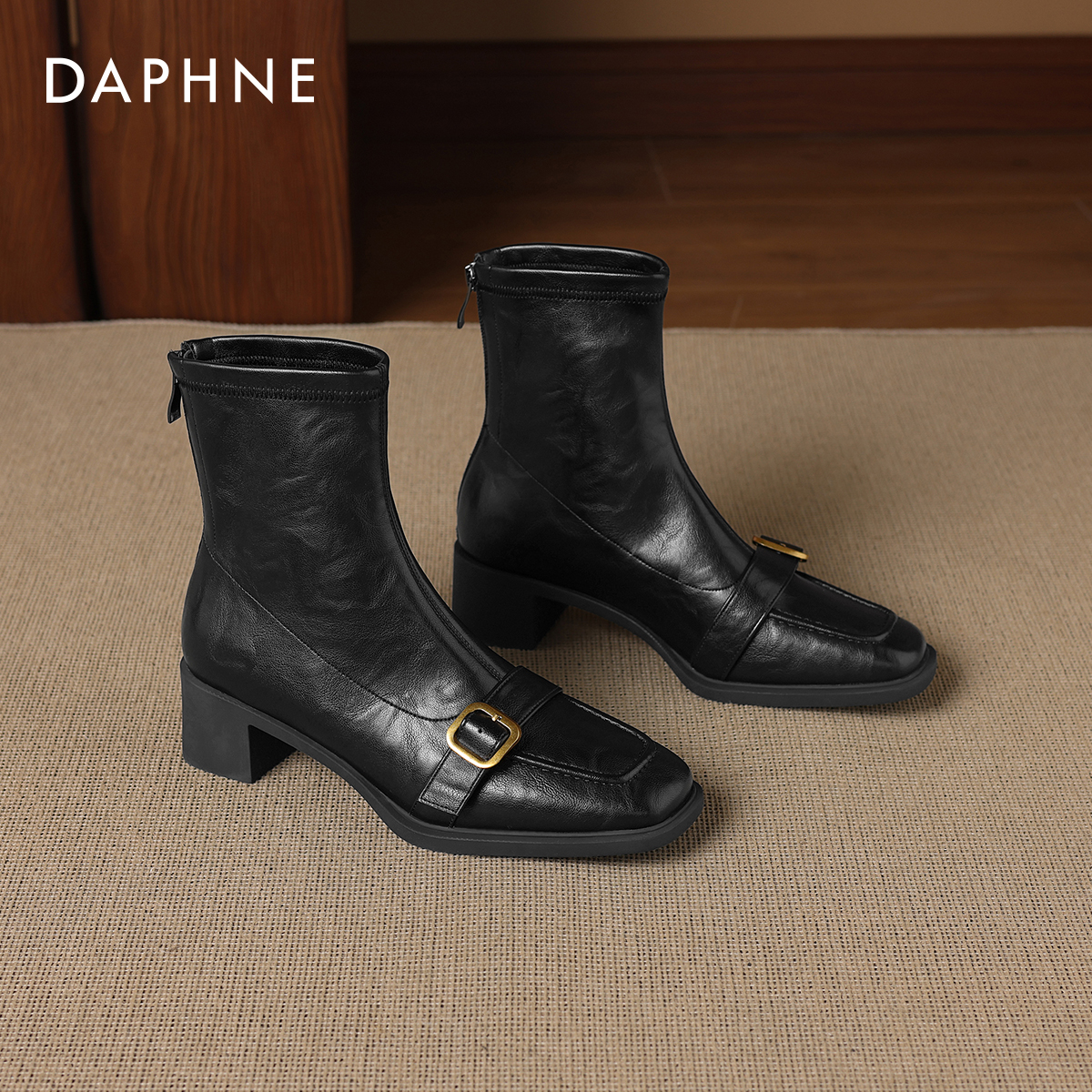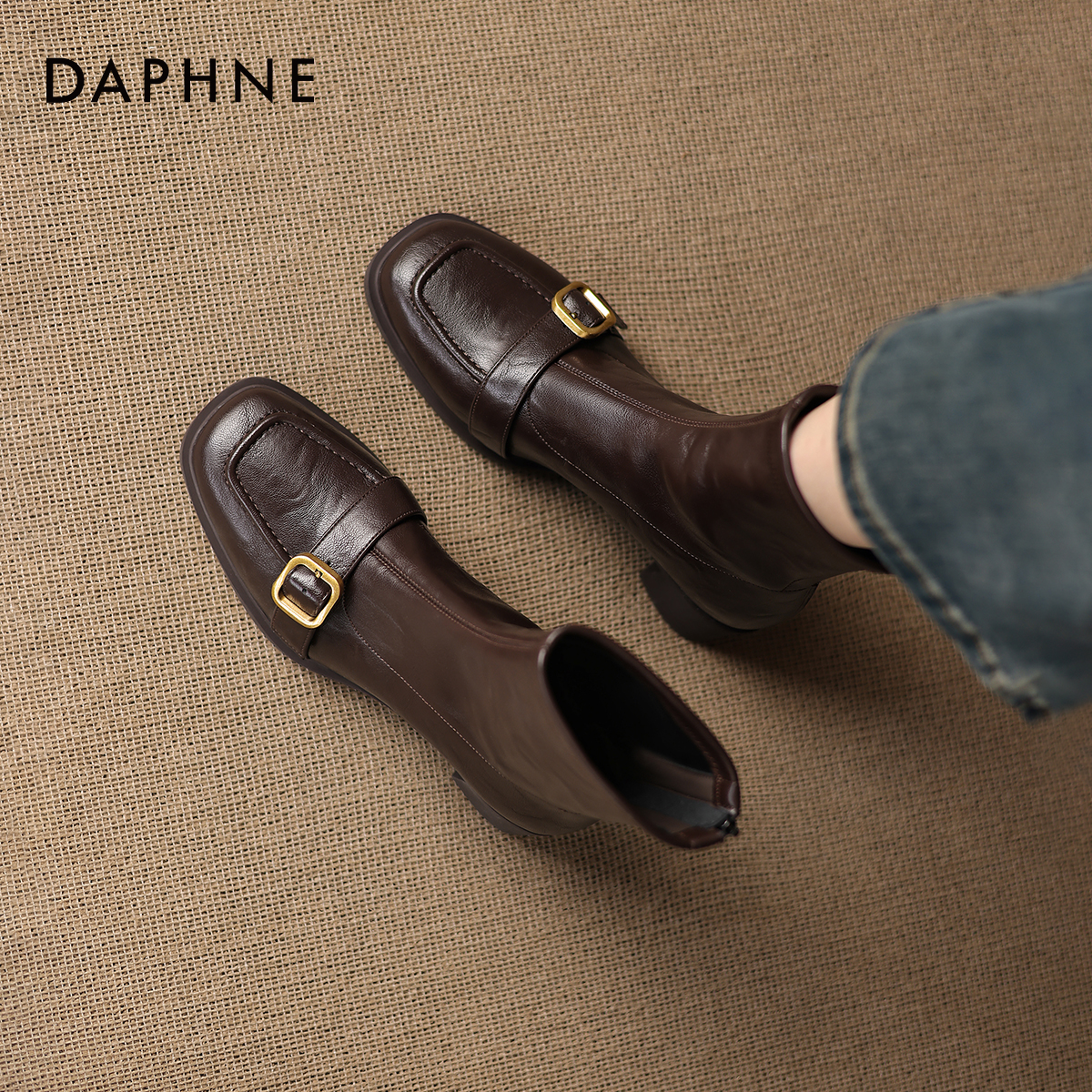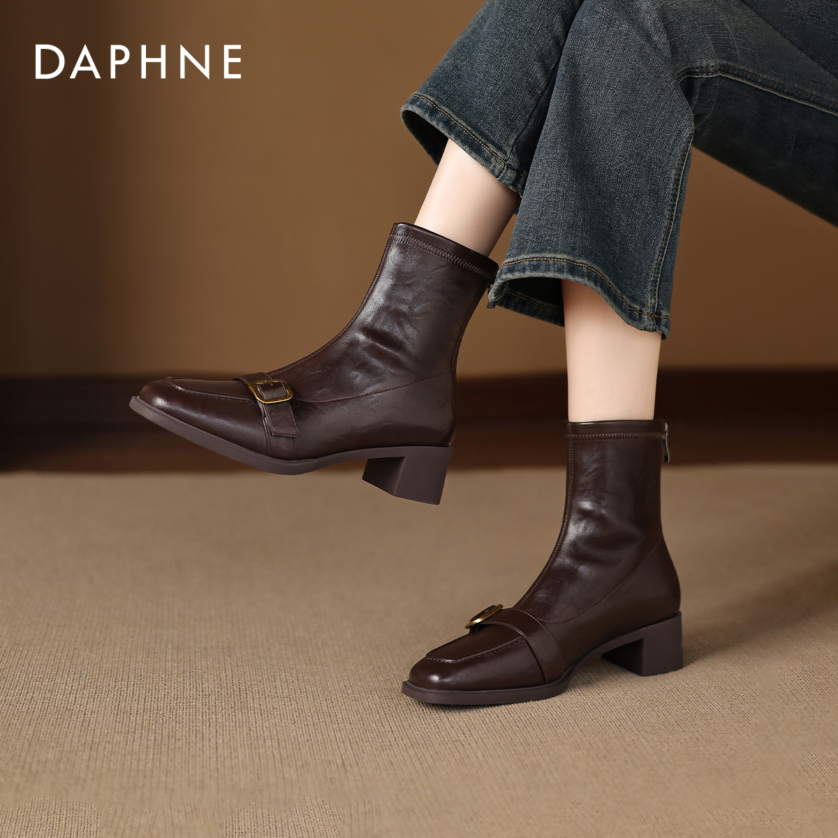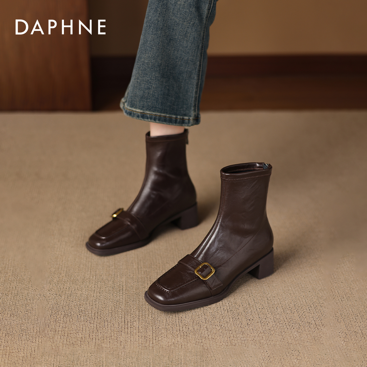 达芙妮方头棕色瘦瘦小短靴2025新款秋冬季加绒女款皮靴子马丁女靴